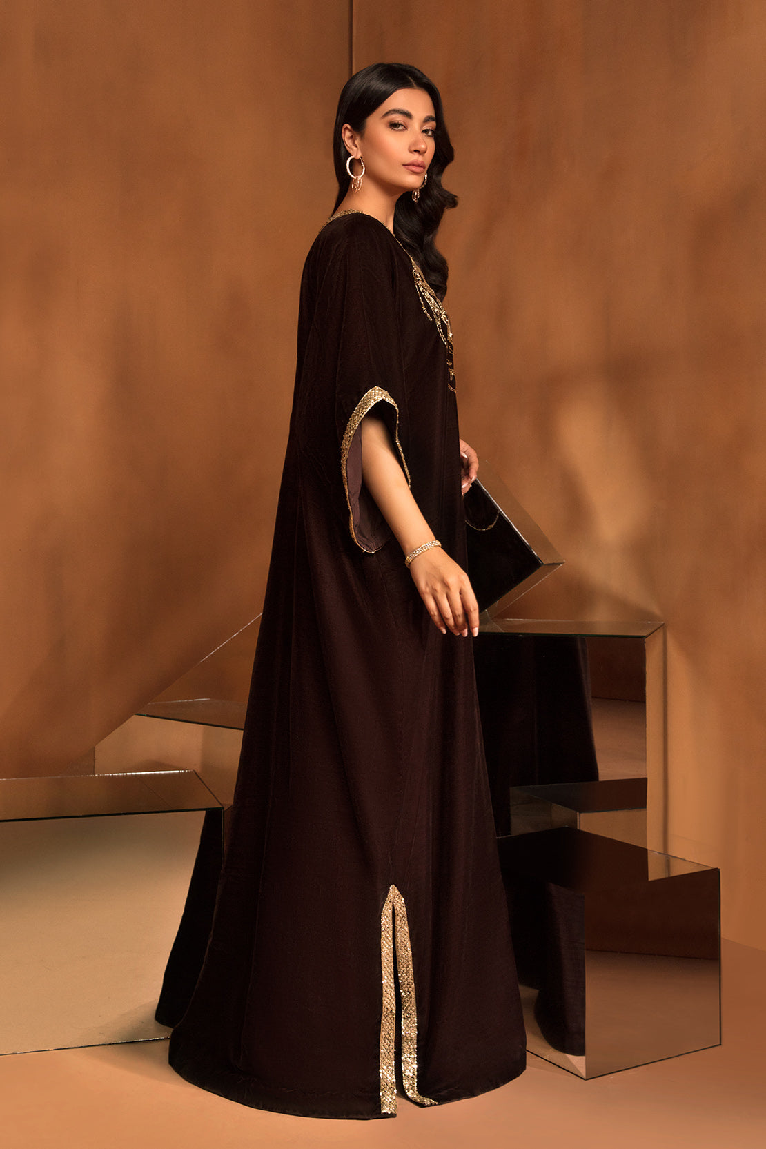 Presenting a niche elegant kaftan in our diverse velvet collection. Comfort and elegance are blended together in this kaftaan. Decorated with golden sequence , cut stones makes it a perfect fit for your winter events.