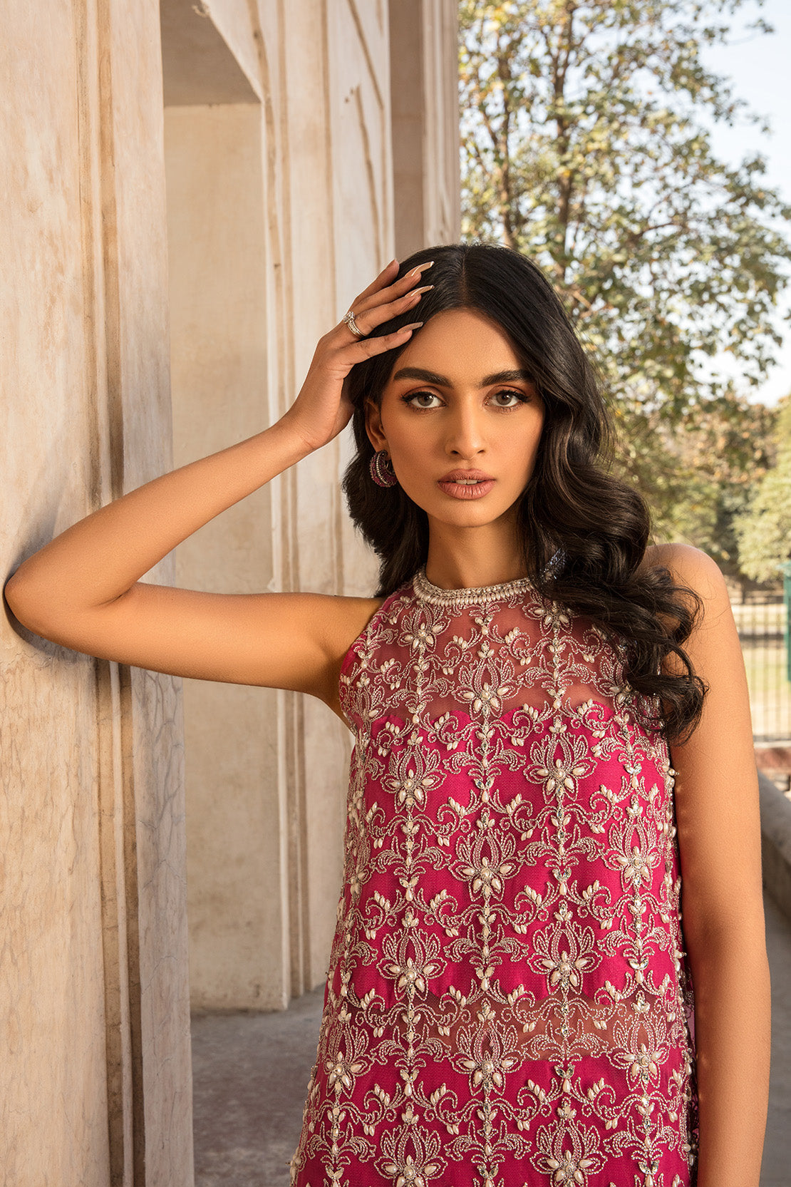 Introducing the right pink for this festive collection. The hot pink floral jaals with hand embellishments of pearls and stones and modern cutline is surely the head turner this season.
