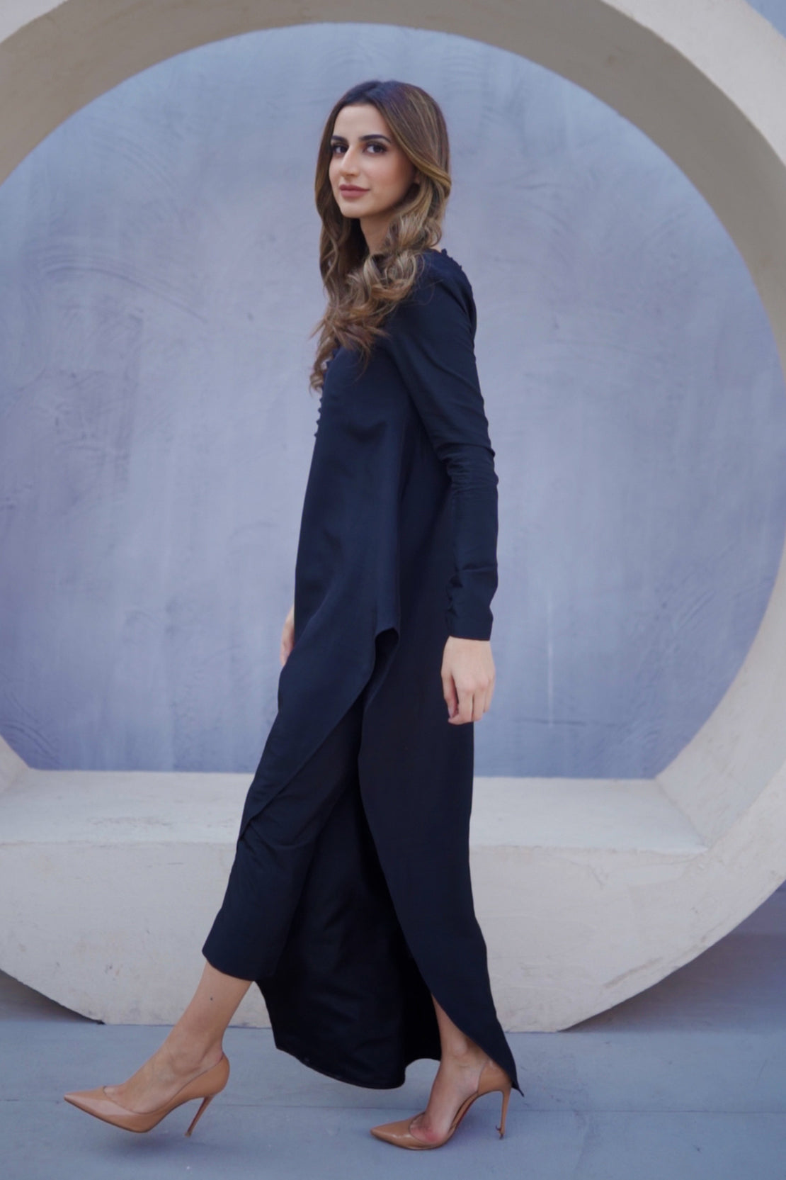 Launching Noya chapter 2 with asymmetrical black shirt of pure raw silk. Embellished with black sitara , cut Dana and moti. Paired with cigarette pants makes the look niche and modern.