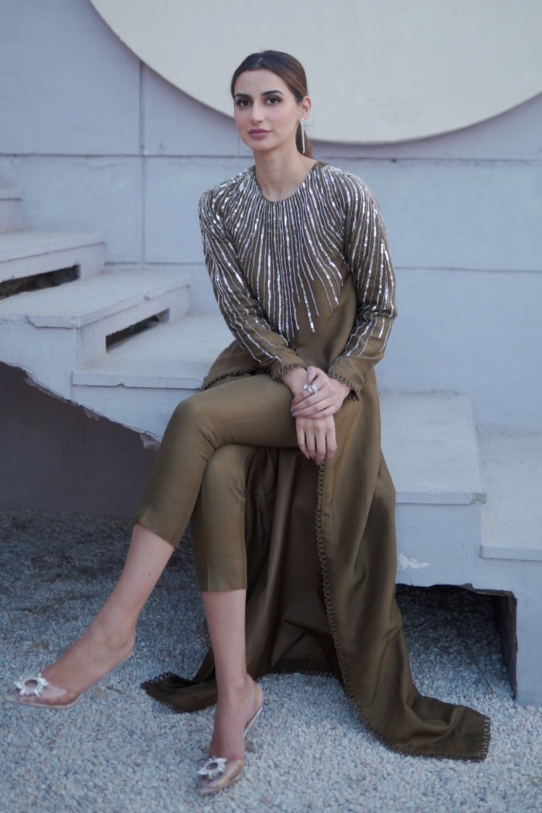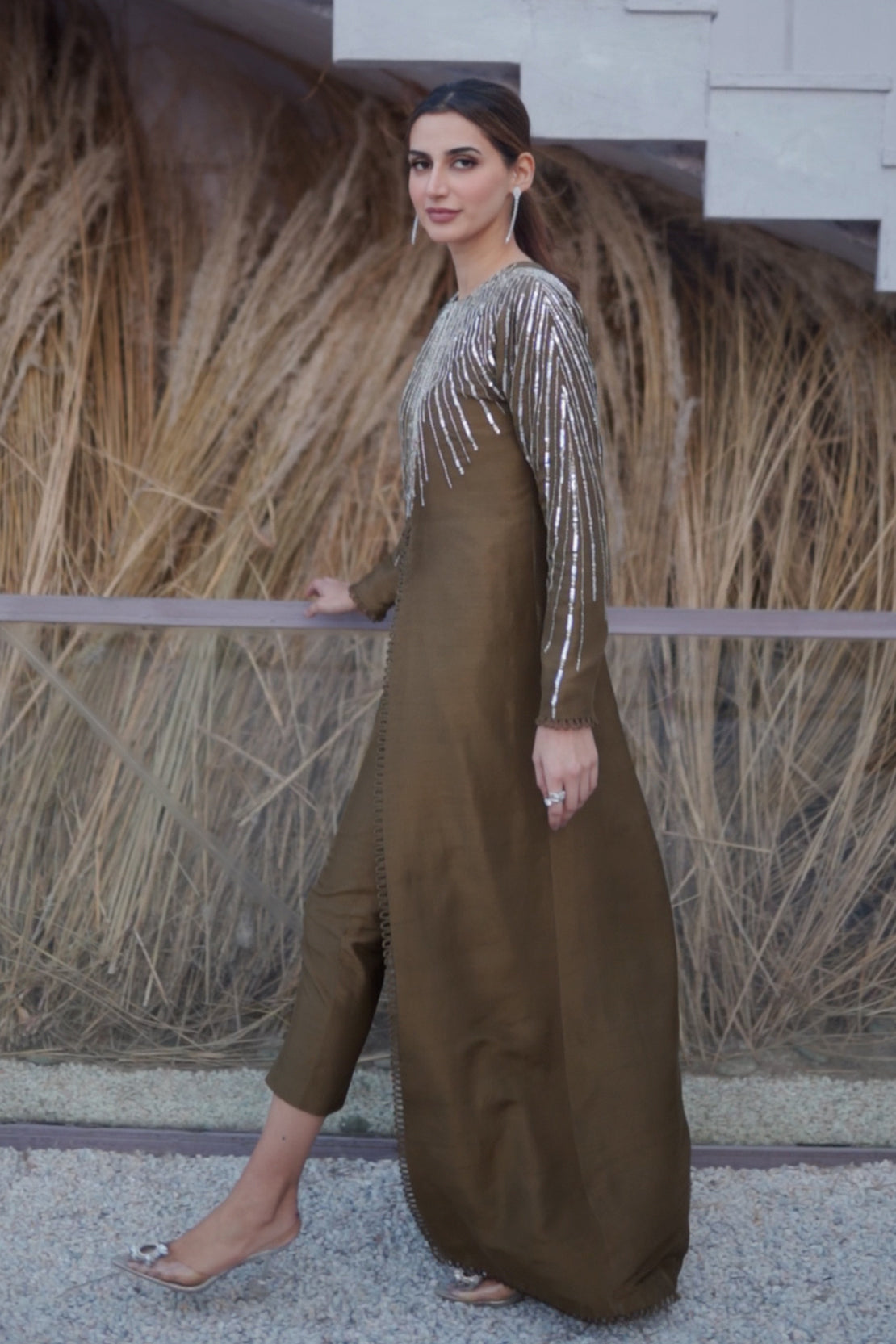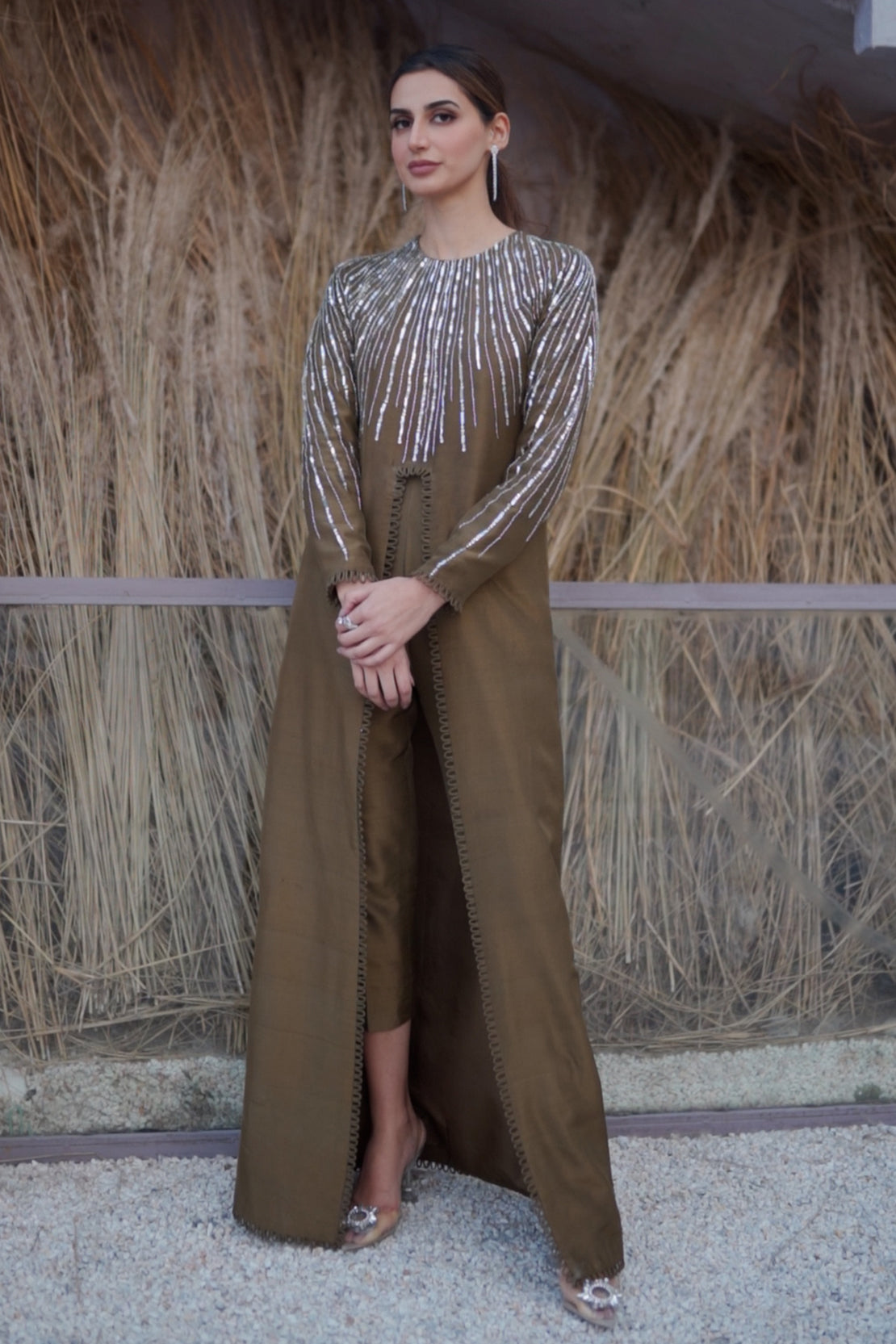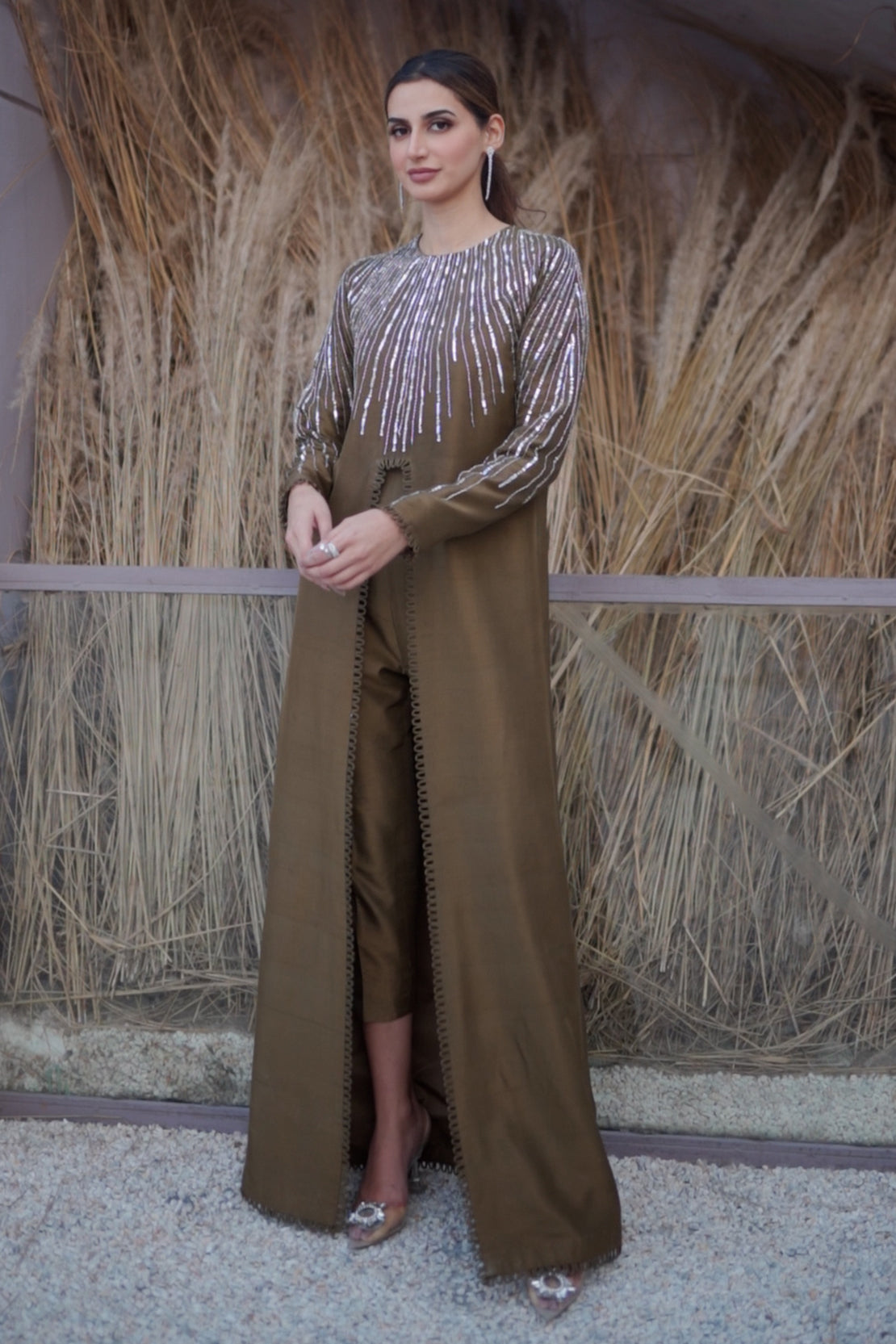 Blend of color, sequence , cut stones and sitara intricated into delicate lines on the neckline. The front open gown paired with cigarette pants serves you a modern niche look which is the perfect formal wear this winter.