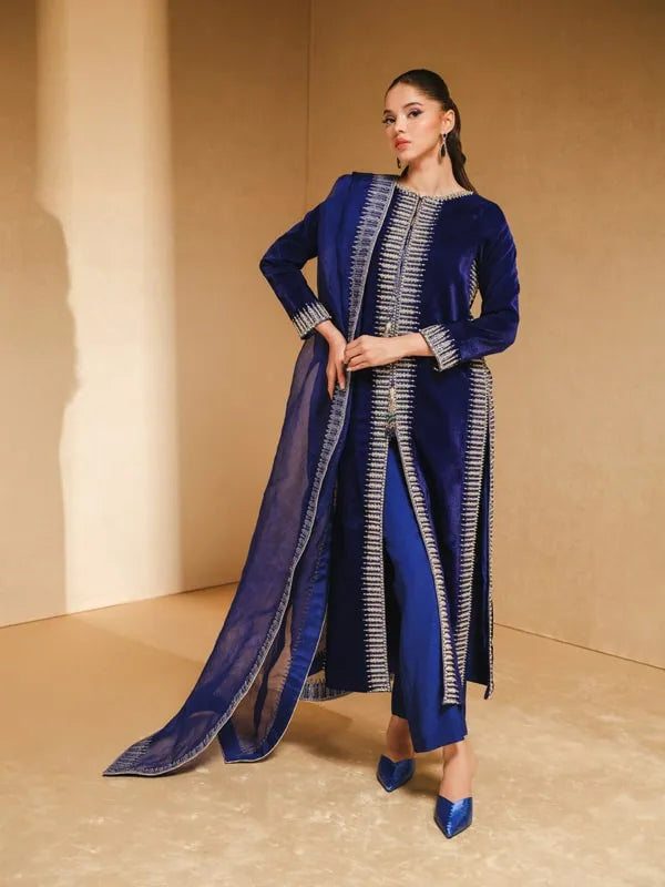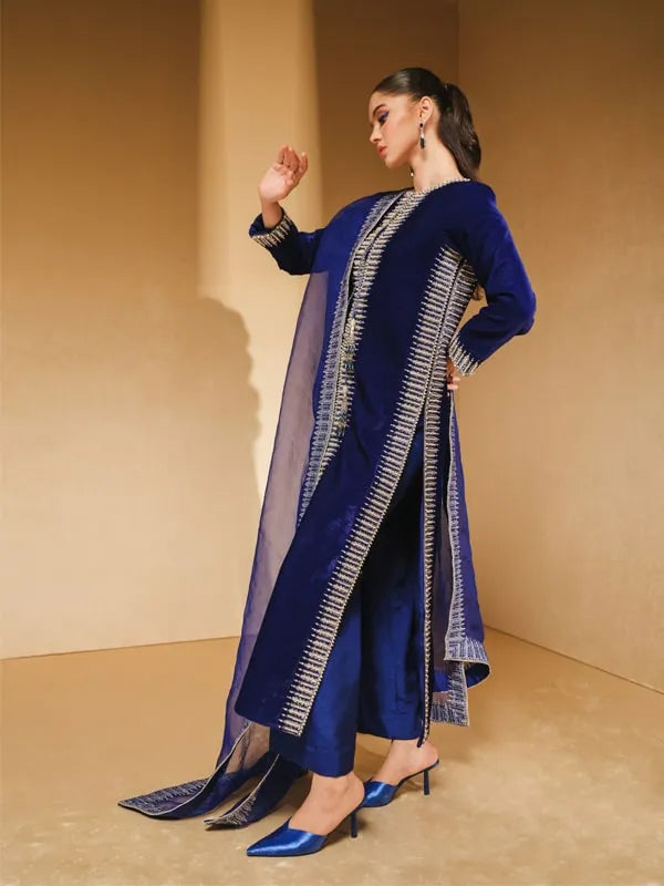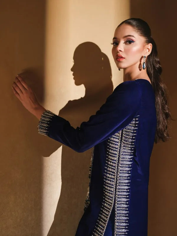 Indulge in luxury with this exquisite Royal Blue velvet shirt with an ensemble of crystals, cut dana, and sequin enriched with tilla work designed. Straight plain Korean raw silk pants. An organza Dupatta with light tilla border.