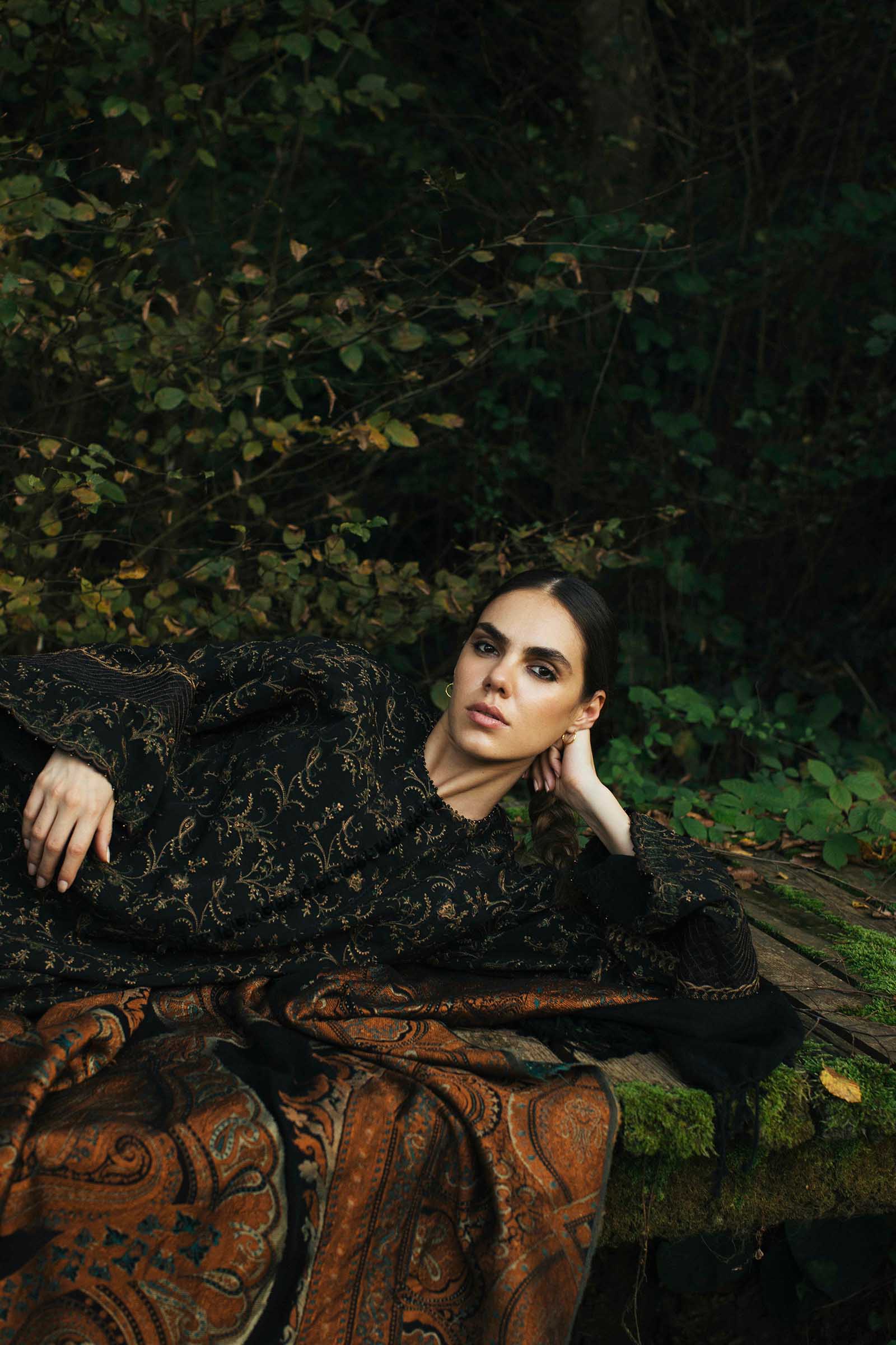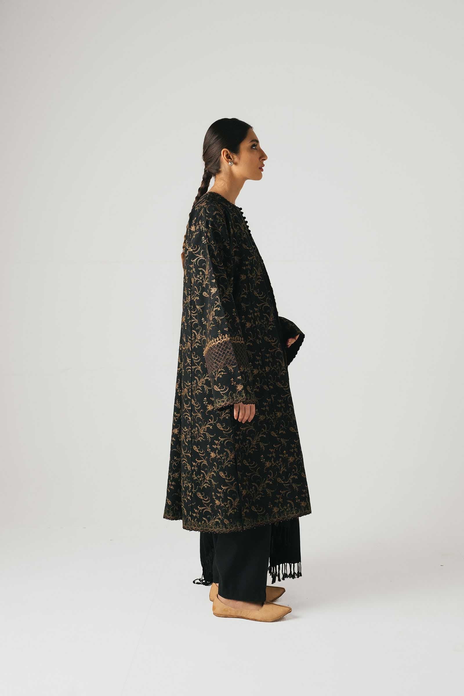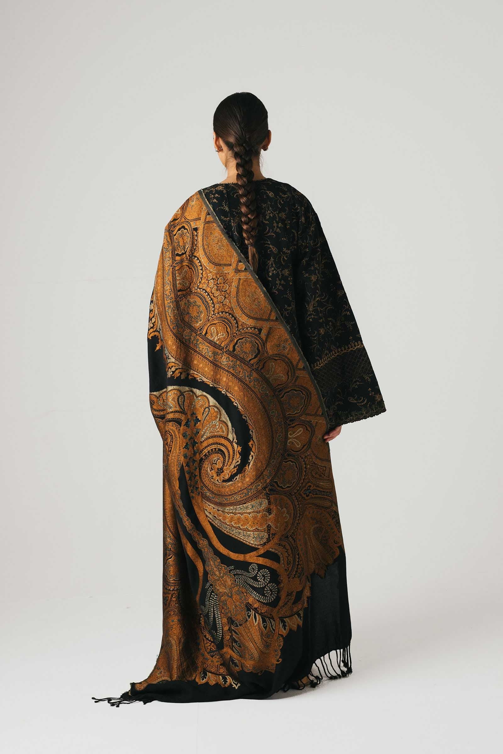 A fully embroidered black shirt with embroidery all over the front, back and sleeves, with additional embroidered pattis for the neckline, sleeves and ghera