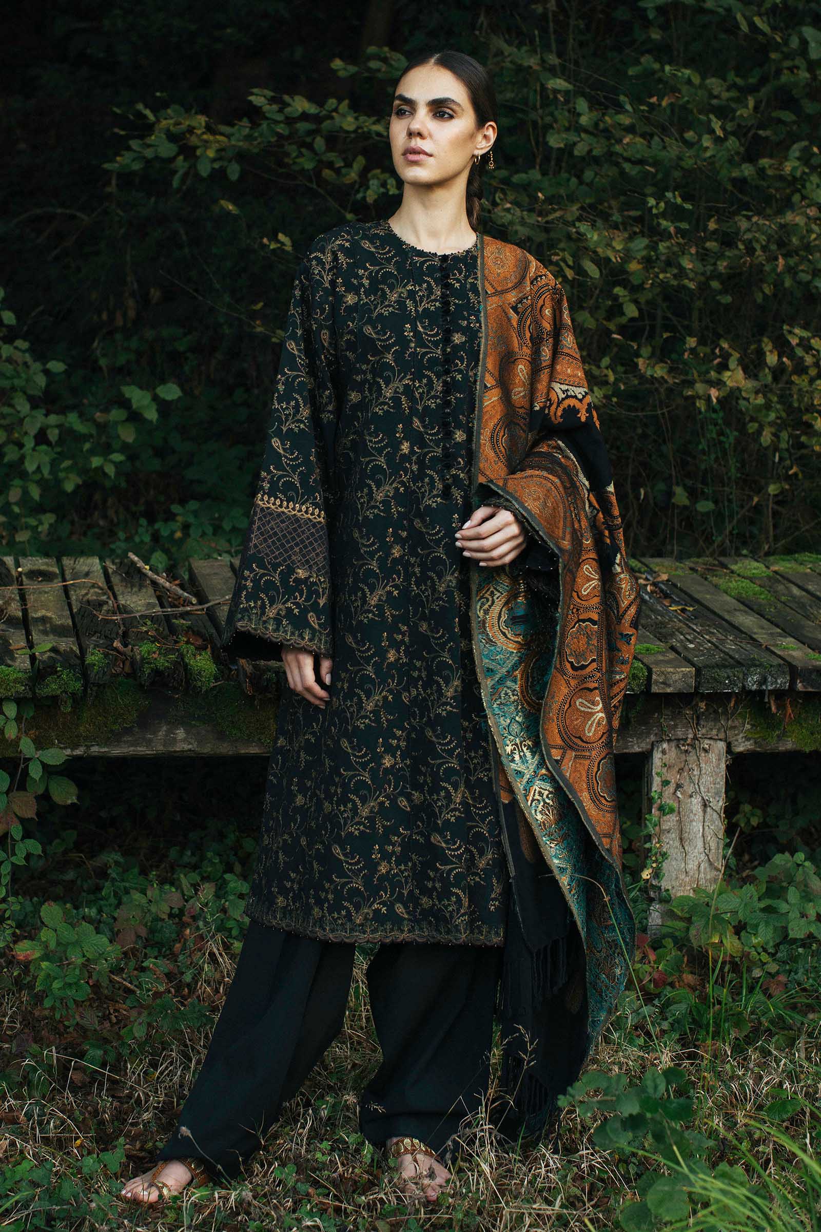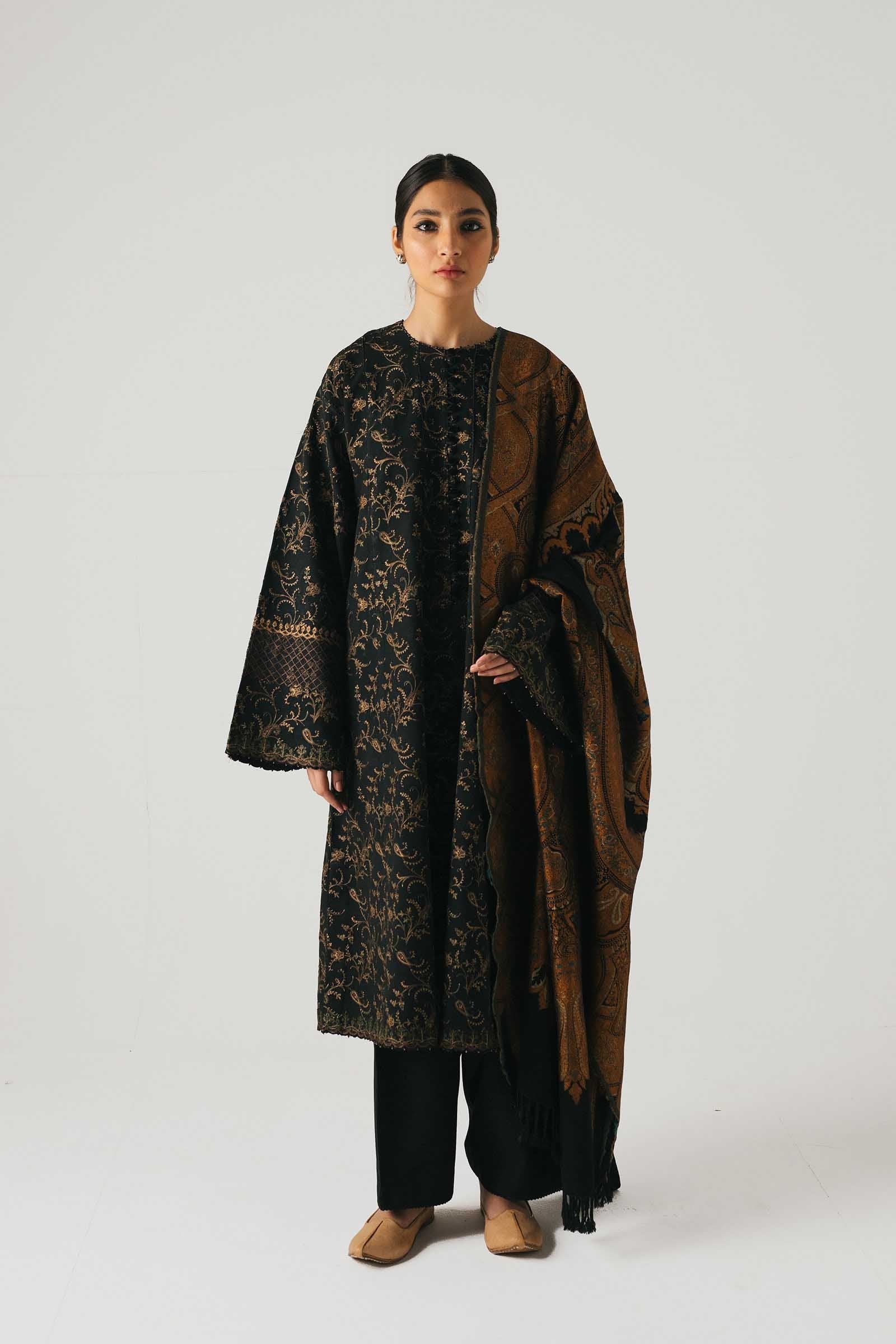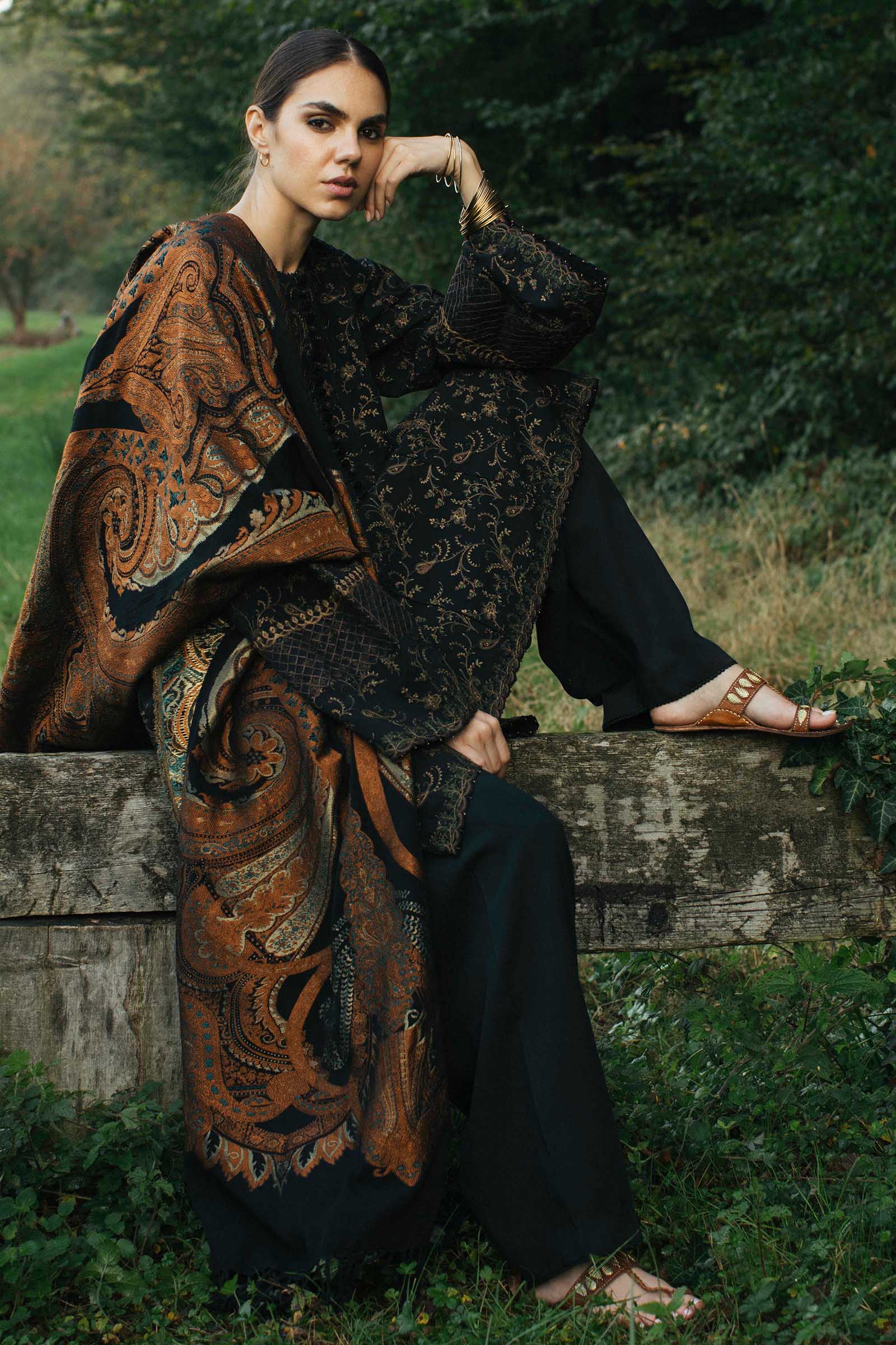 A fully embroidered black shirt with embroidery all over the front, back and sleeves, with additional embroidered pattis for the neckline, sleeves and ghera