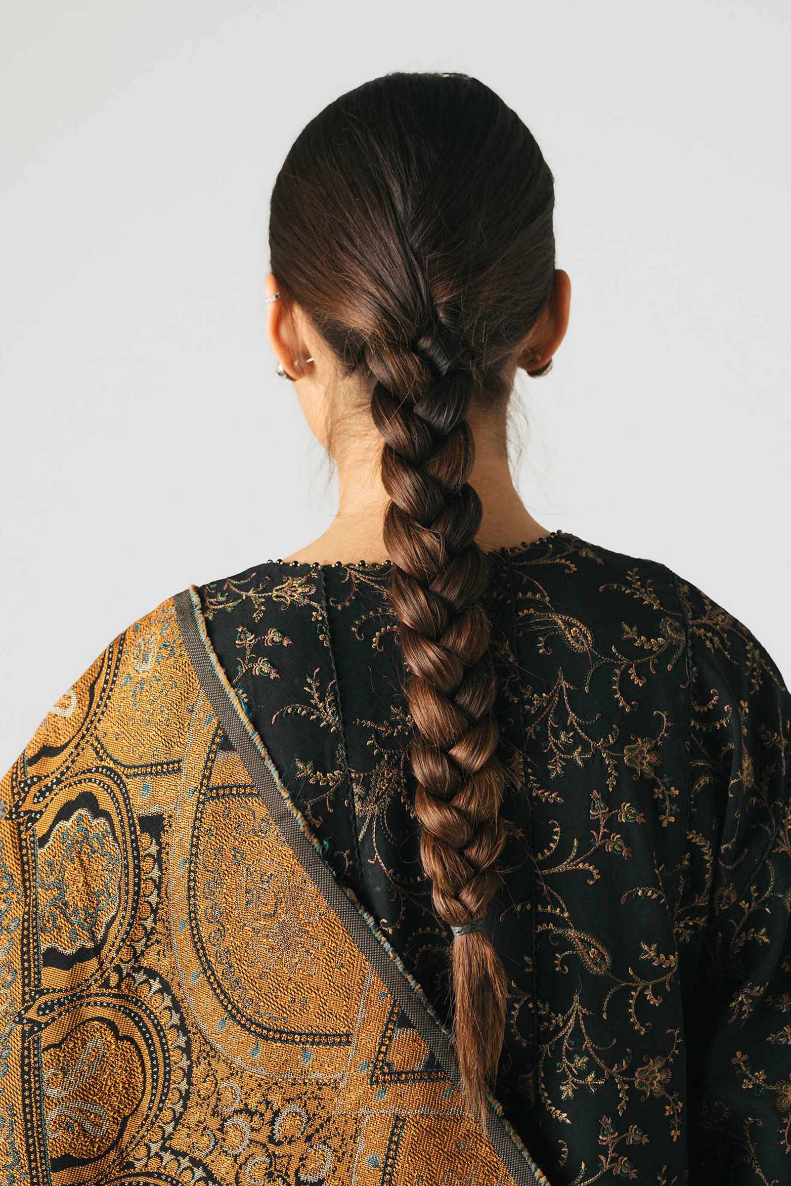 It is paired with a heavy jacquard shawl and plain dyed trousers