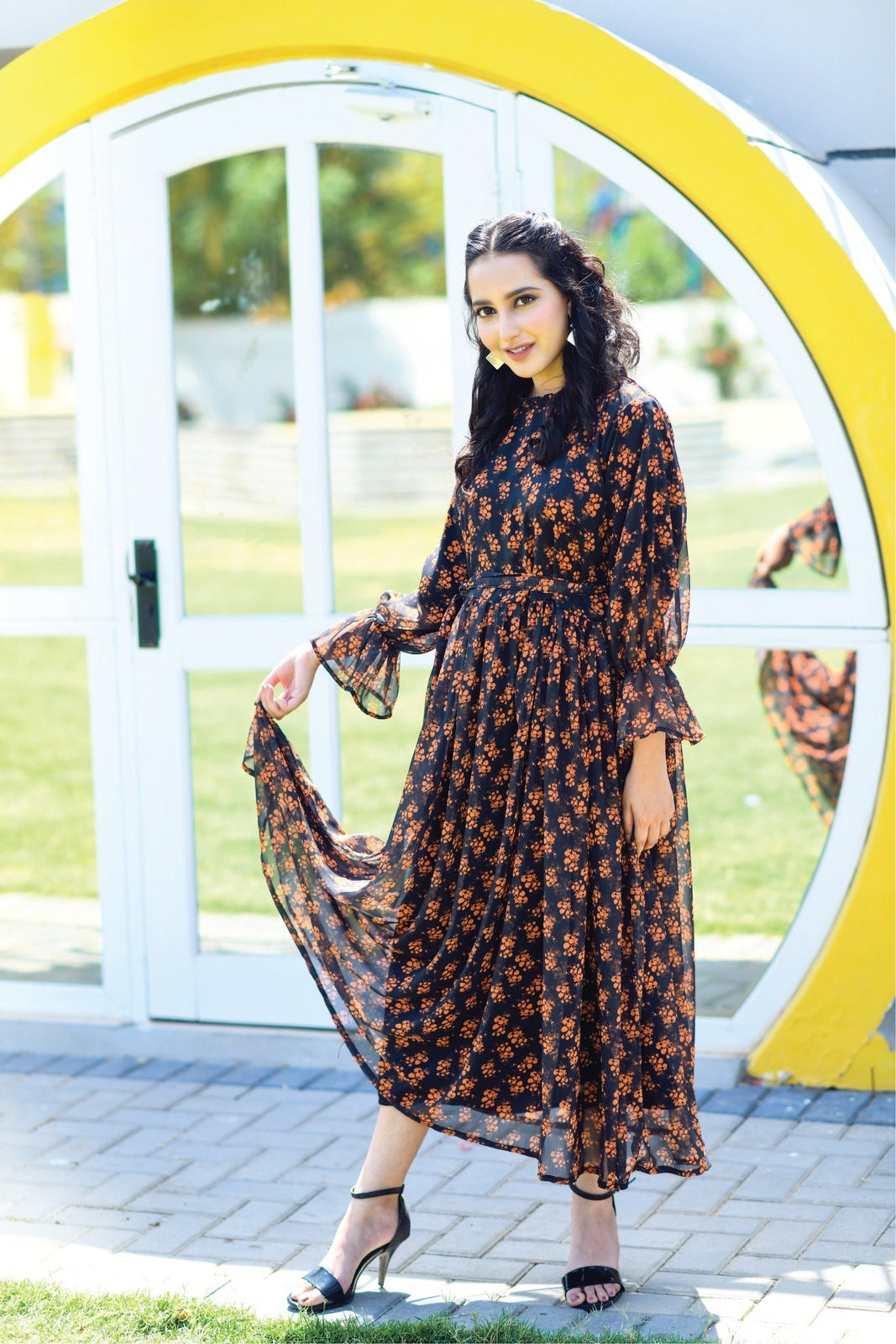 Bareeq Outfits - Chiffon Orange/Black Digital Printed Frock
