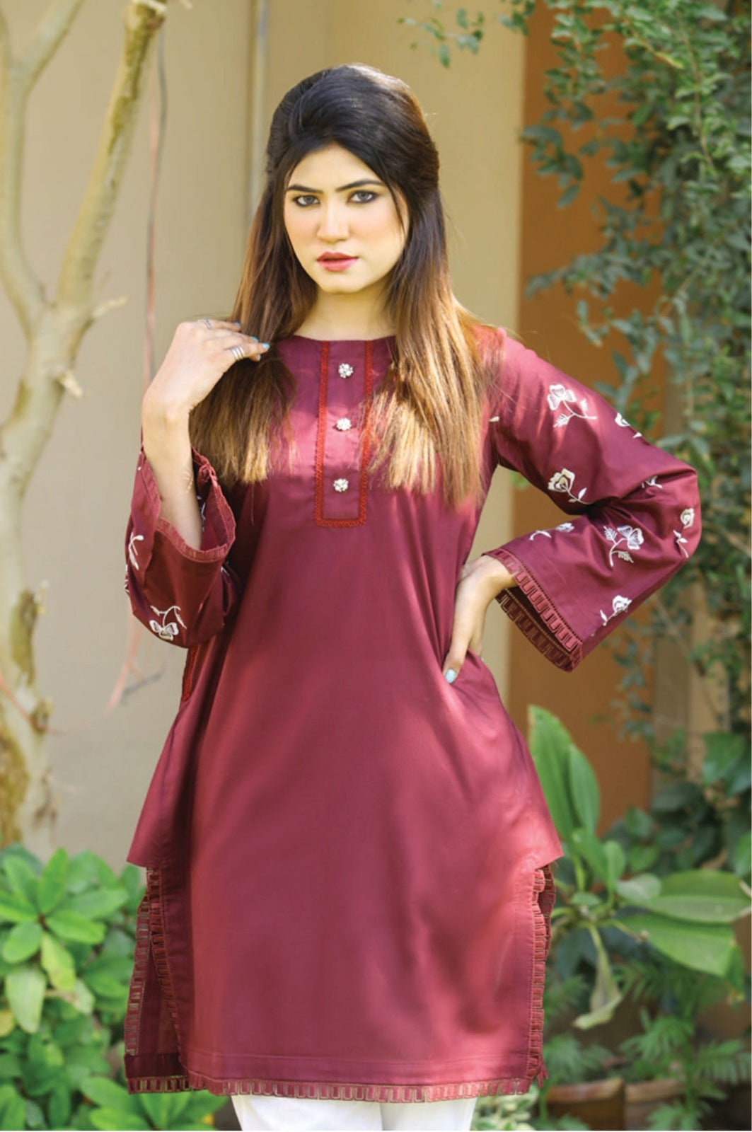 A beautiful maroon shirt with white floral embroidery all over the sleeves, floral button, and lace detailing on neckline, sleeves, and daman is all set to leave an everlasting impression.