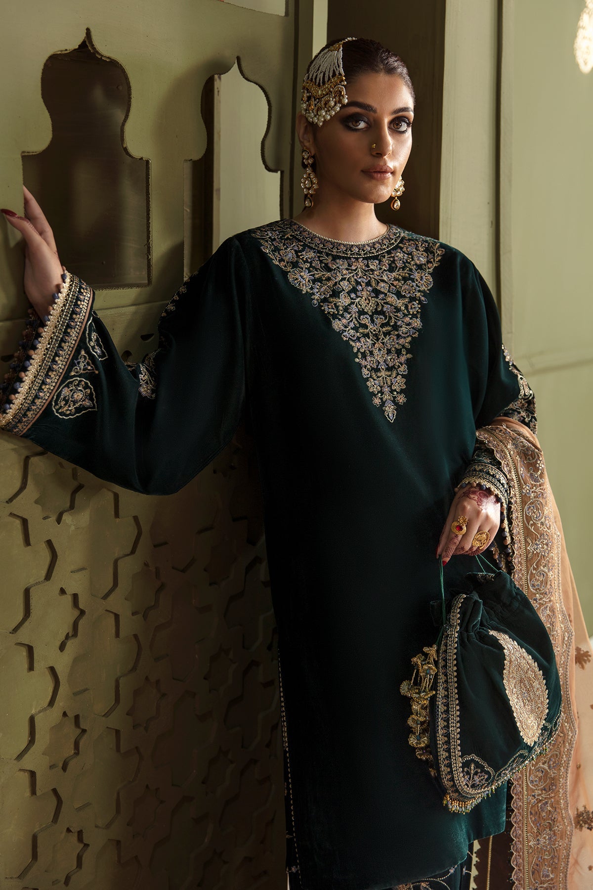 This green coloured velvet dress radiates an aura of refinement. The embroidered embellishment at front and back adds a finesse touch. The dress comes in contrast with elegant organza dupatta having an embroidered silk border. Embroidered velvet trouser elevates the overall splendour of dress.