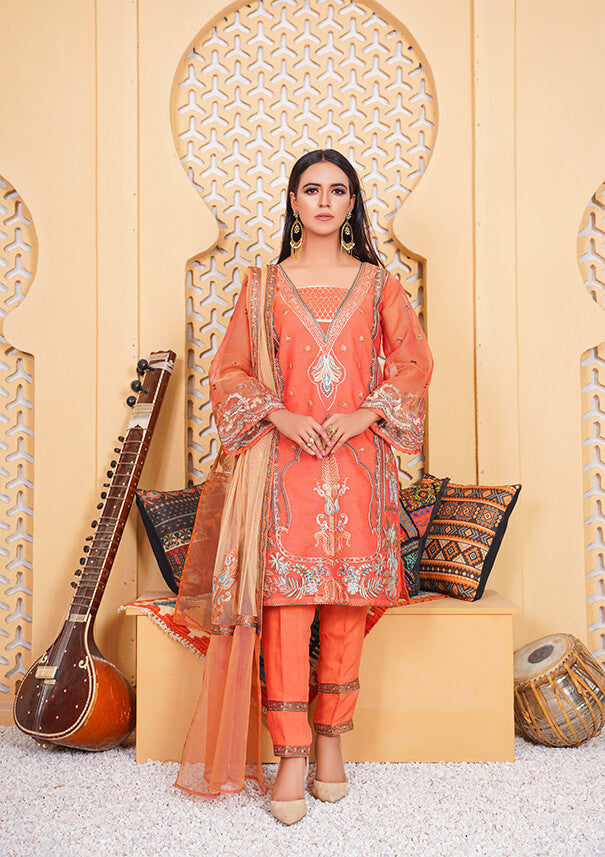 A subtle yet striking semi-formal ensemble made to perfection. This alluring multi-head organza shirt is decorated with fine embroidery work all over the front with the details of laces on it. This beautiful shirt is paired with perfectly stitched raw silk pants in the same hue. The look is completed with a contrasting skin-colored net dupatta detailed with orange organza borders with embroidery & motif patches on it giving it a distinguished appearance.