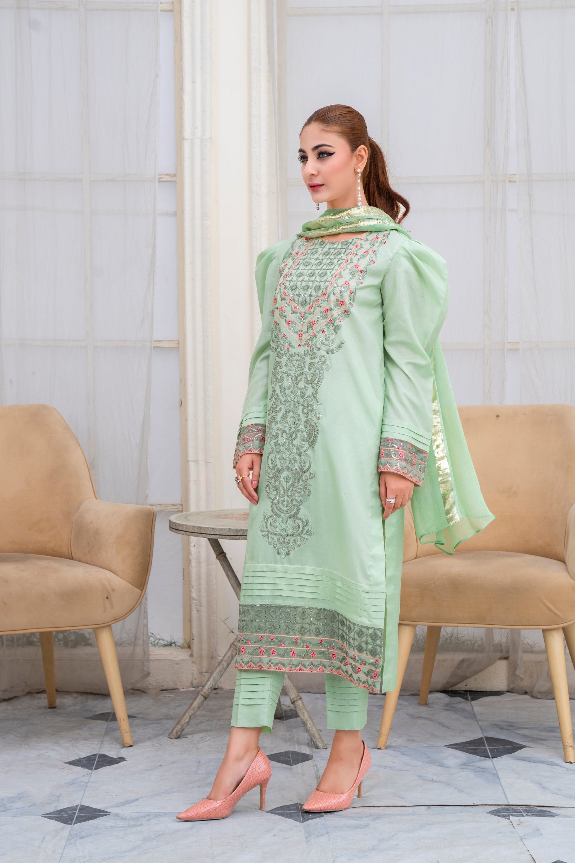 A traditionally rich composition is portrayed in this elegant ensemble rendered in Aqua shade.