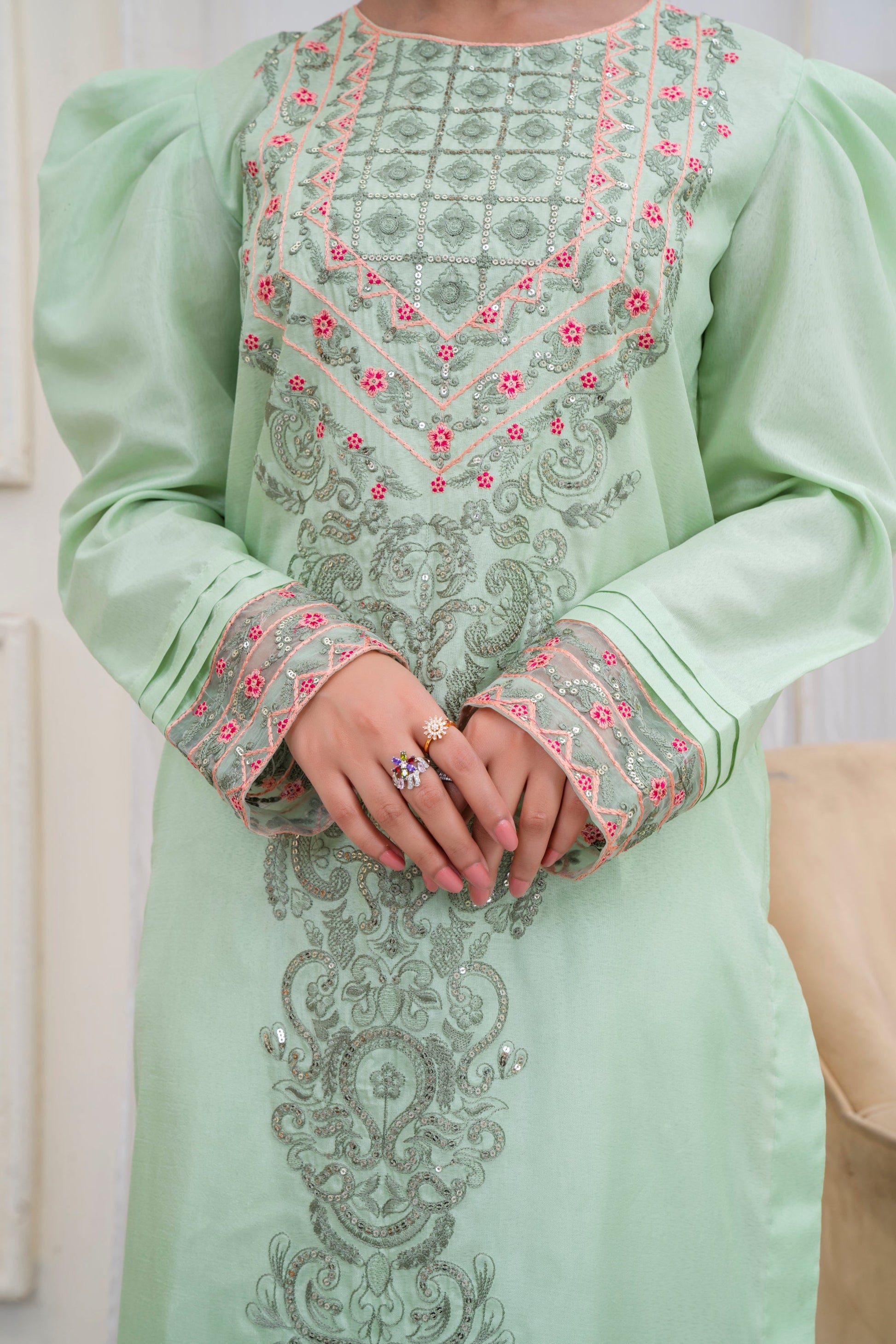 Embellishments feature immaculate embroidery laid out in the finest sequin & organza patchwork on sleeves and hem.