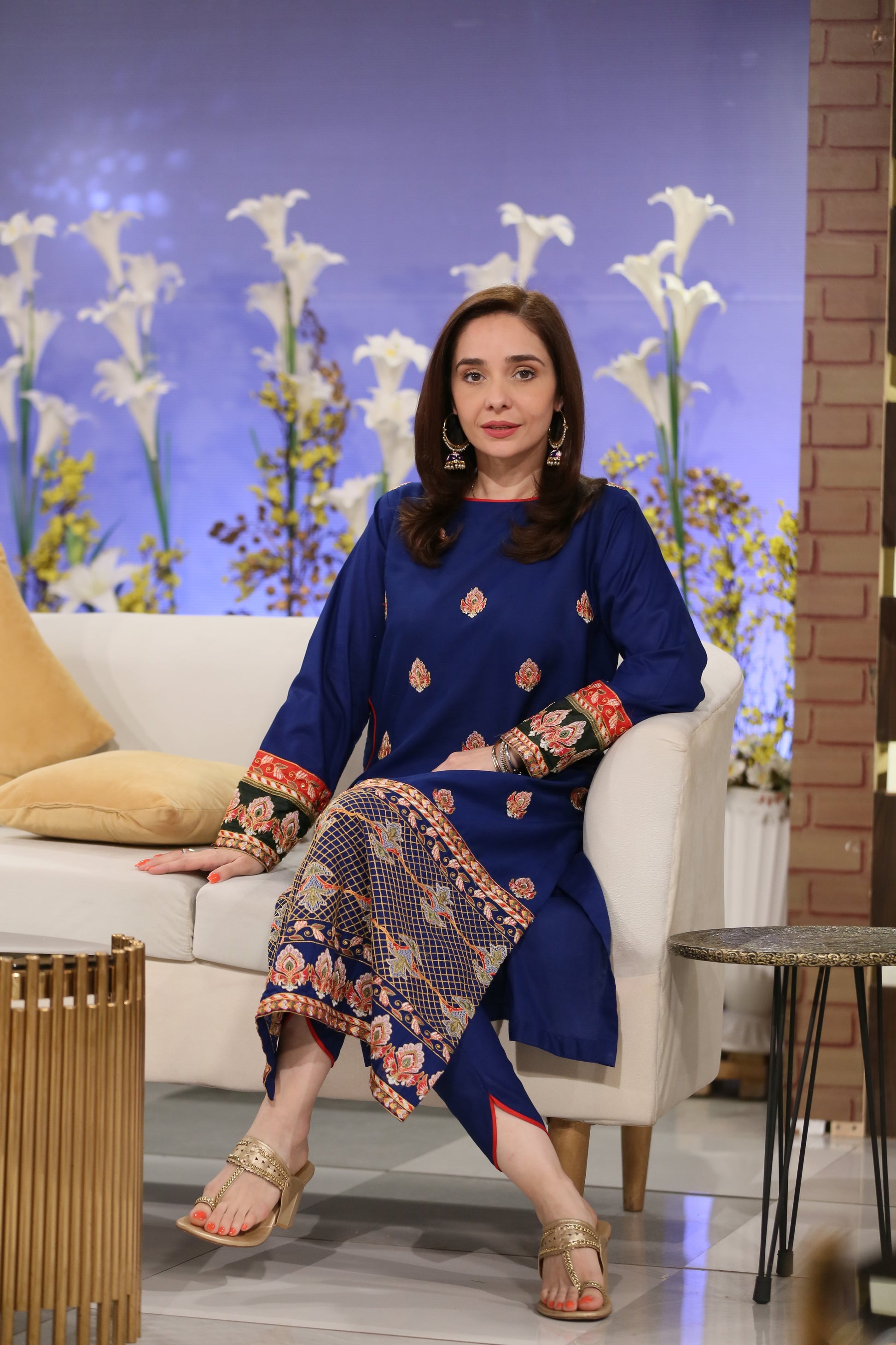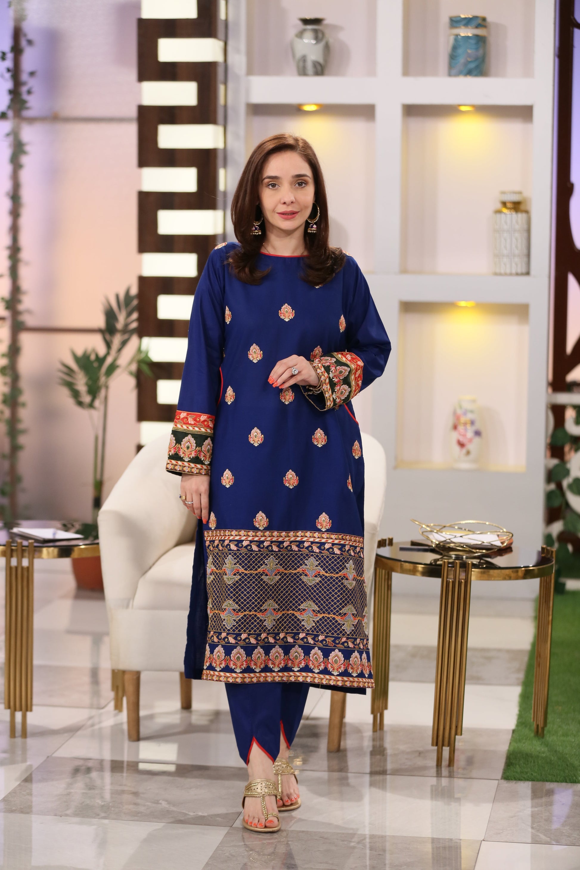 A pure example of timeless sophistication, this exquisite royal blue Breeze Cotton silhouette is classically enriched with intricate embroidery & sequin work at the front, hem & sleeves with captivating motifs composed of enchanting designs with added details of piping on the neckline, pockets & sleeves.