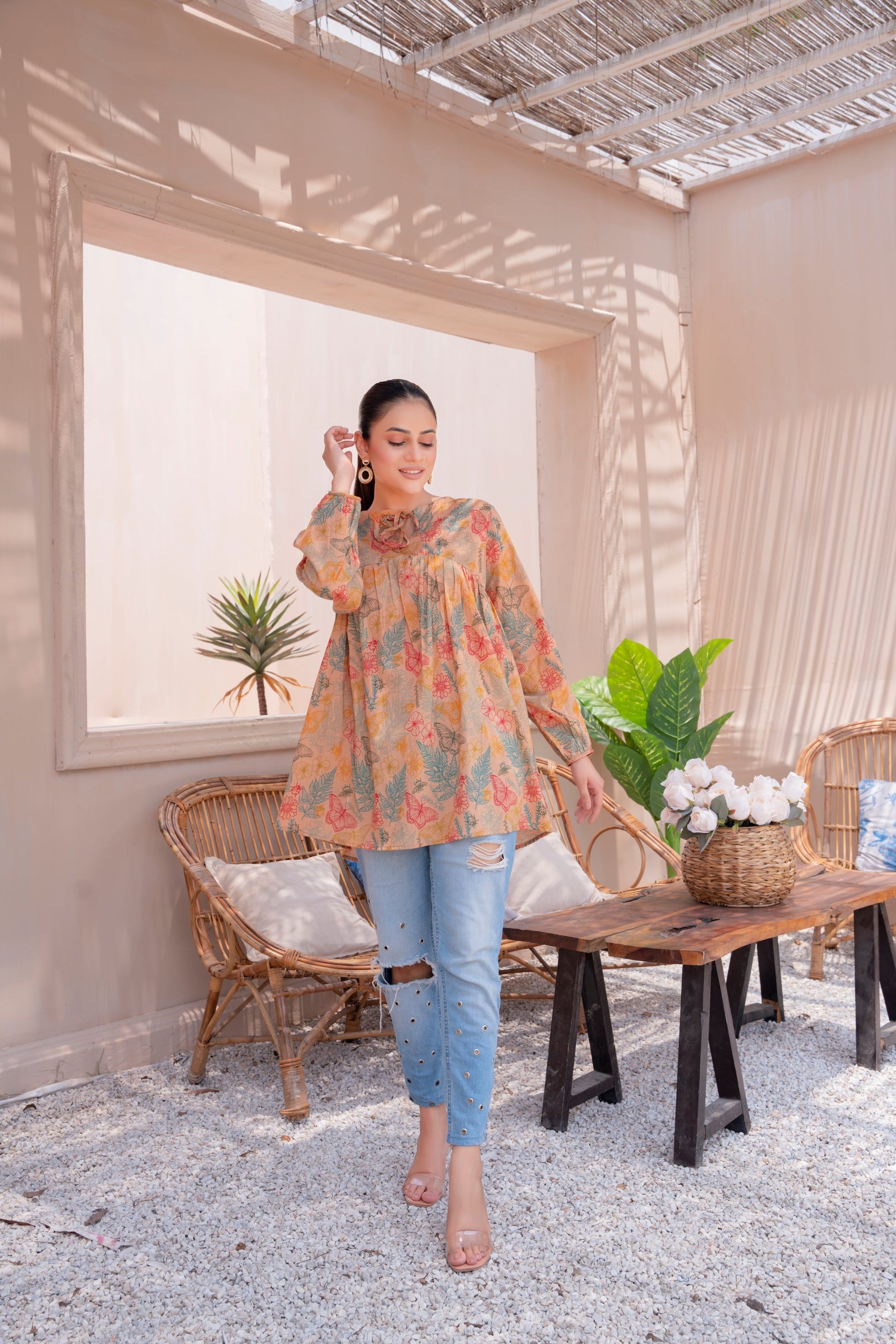 Discover the perfect fusion of style and comfort with this 1-piece ready-to-wear frock, made from floral printed lawn fabric. The frock features exquisite pleat details on the front, adding a touch of elegance to your ensemble for a trendy and chic look.