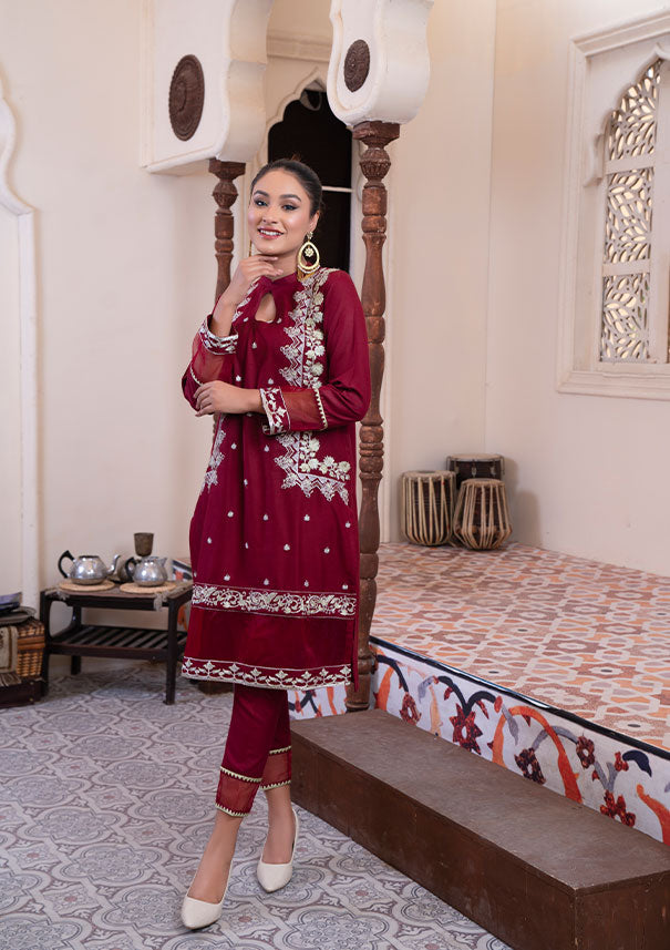 Scintillating styles to freshen up your winter looks. This Maroon shirt With fine embroidery work on the Front and sleeve bottom with organza finishing, Ban with keyhole neckline. Delightfully Gorgeous Maroon dhanak trousers with embroidery smart border and finished with organza.