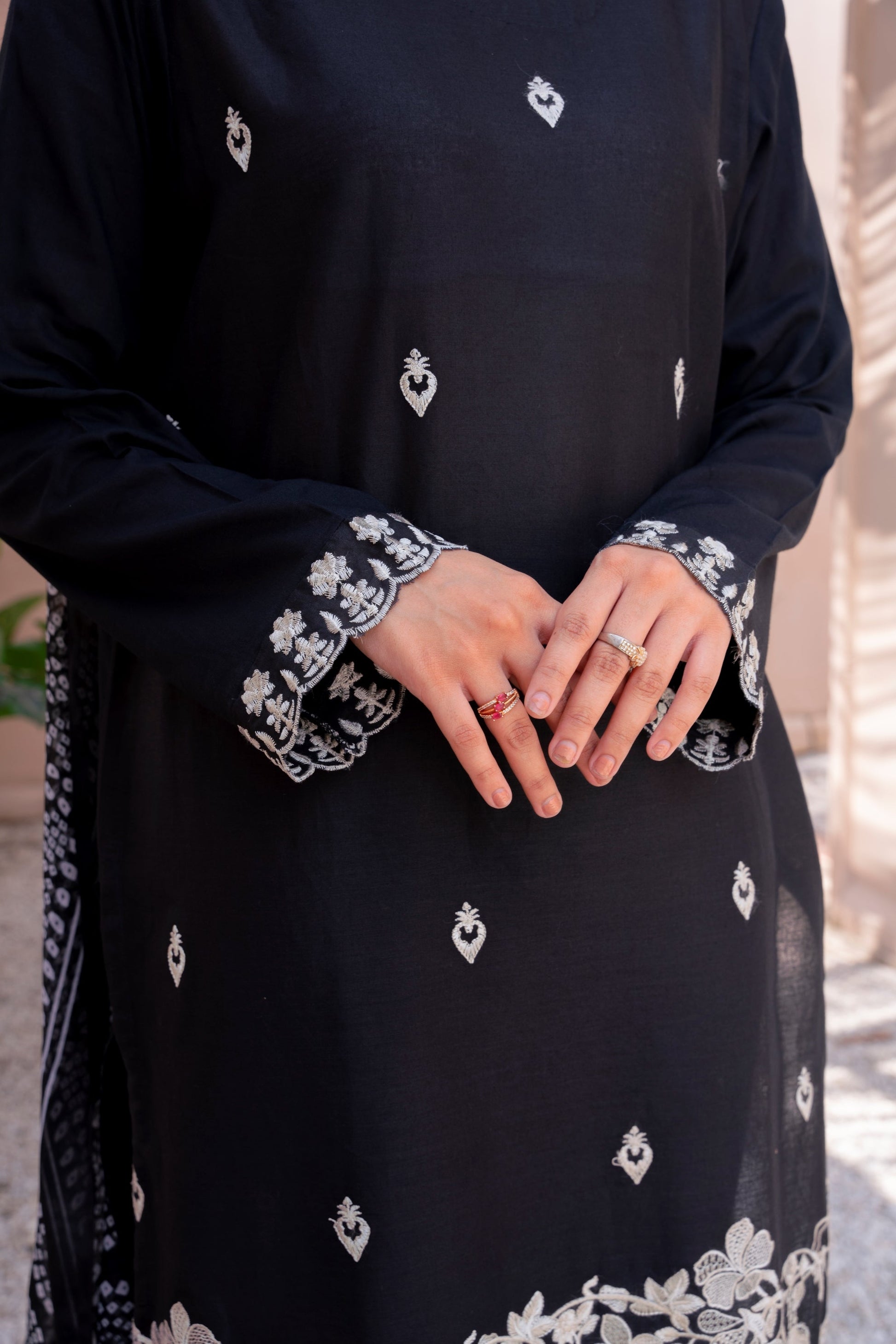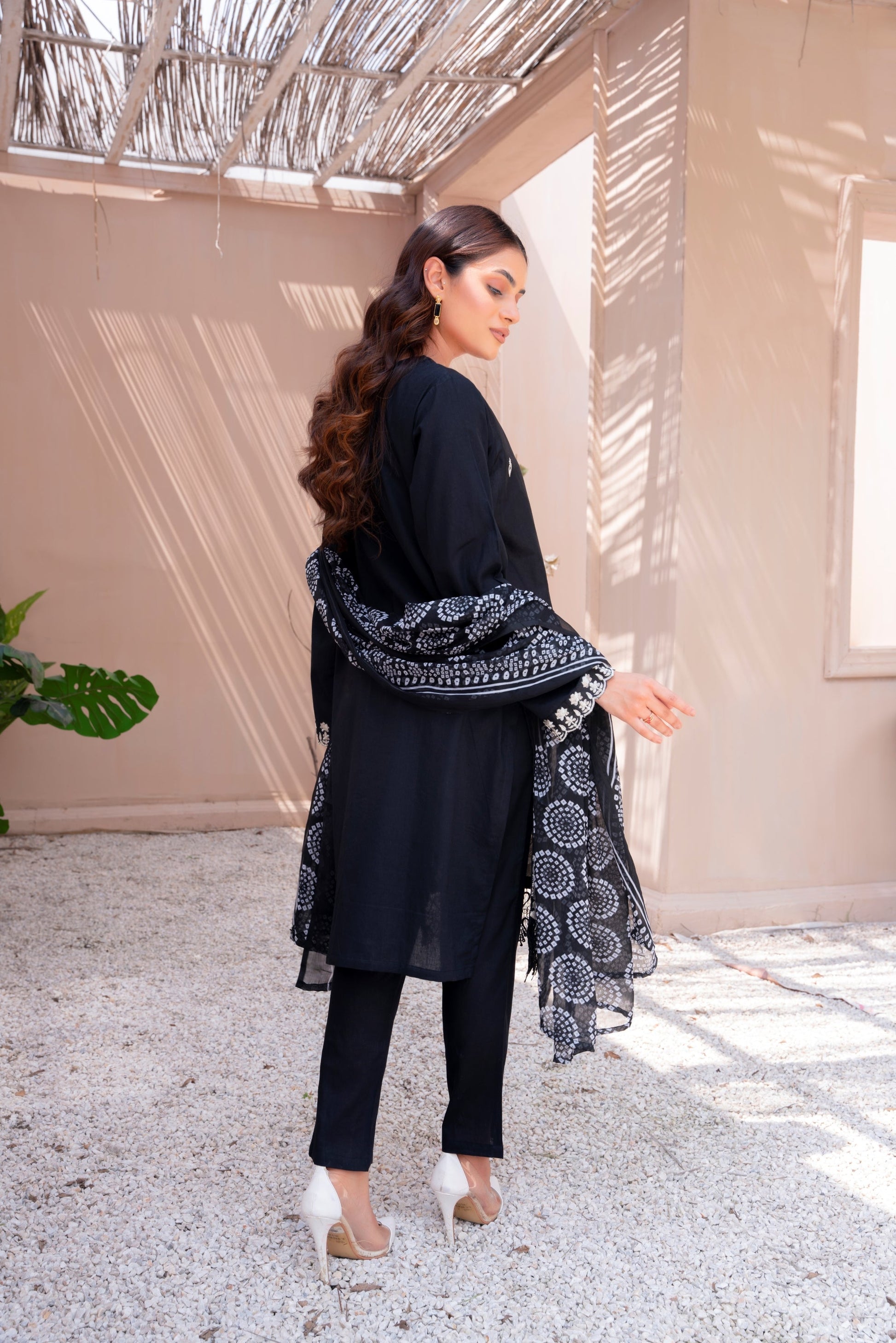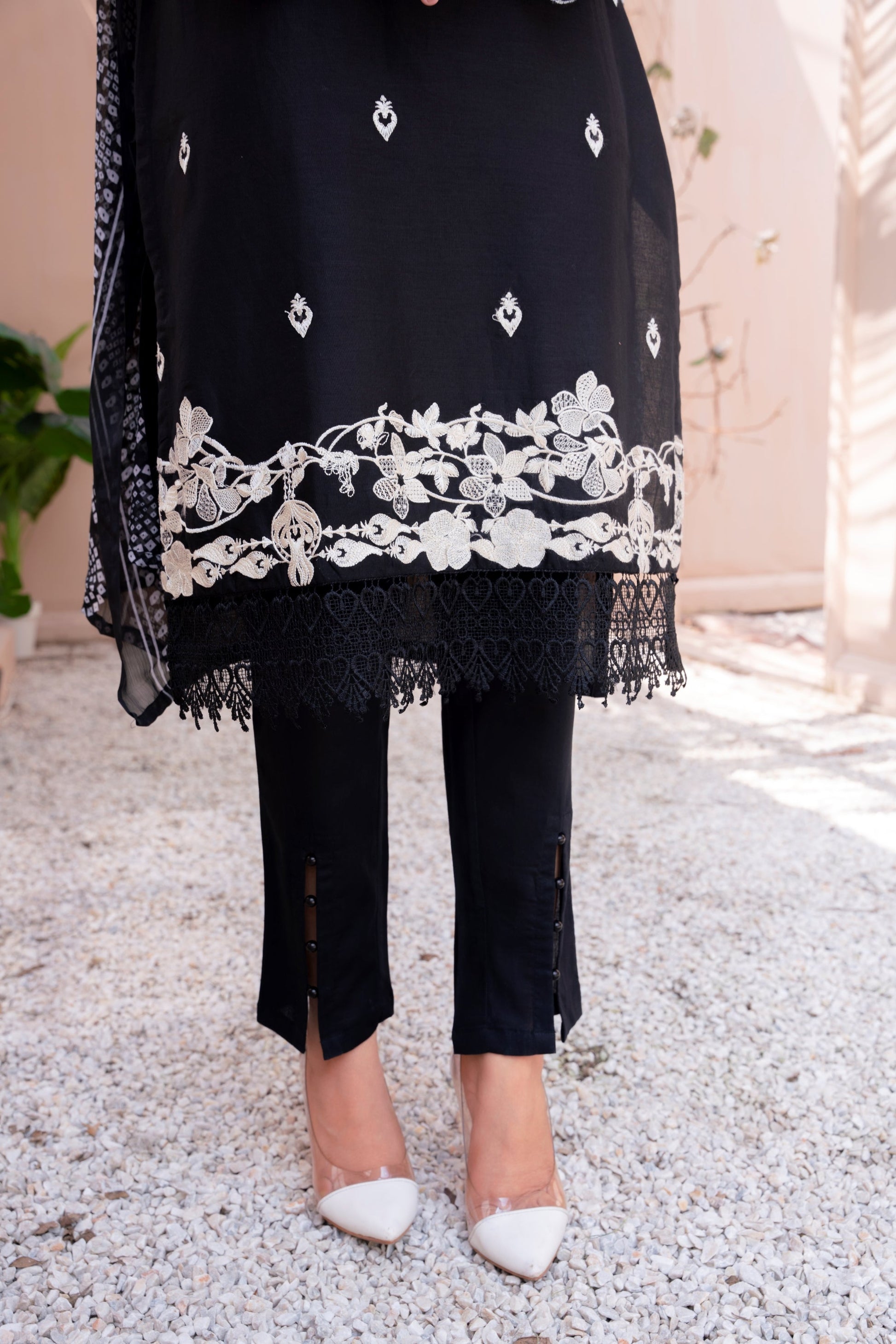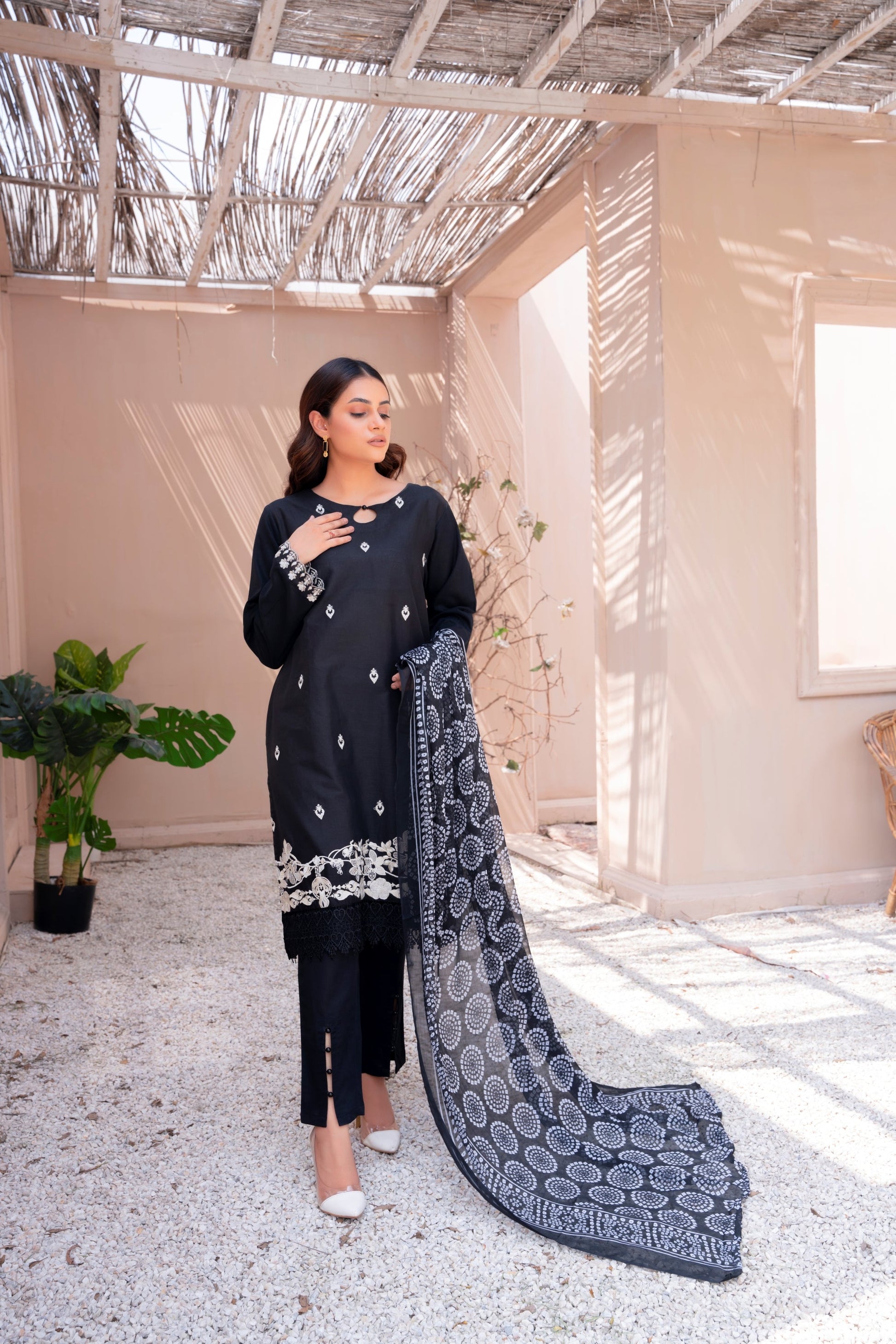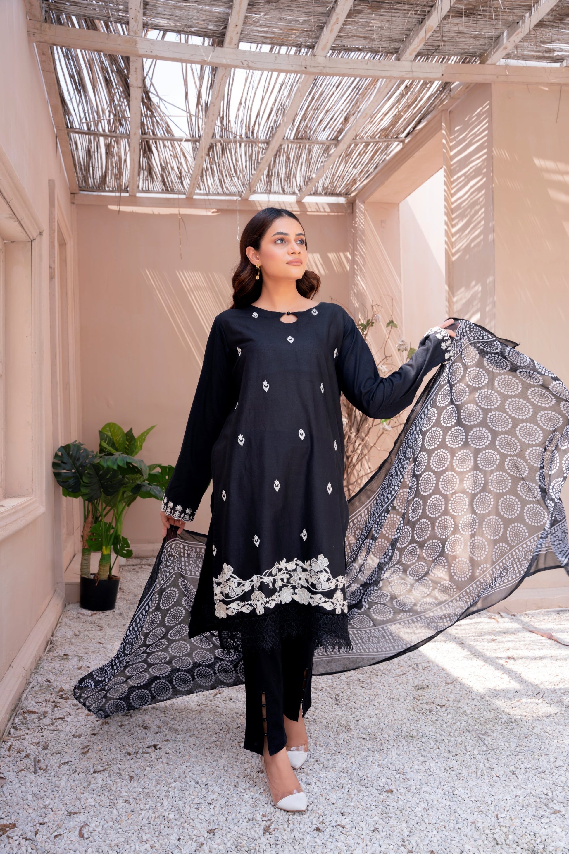 This stunning 3 piece ready-to-wear outfit seamlessly blends the timeless charm of black with the graceful beauty of white embroidery having lace details on the hem. Made from breathable cotton fabric, the stylish kurta and trouser set paired with a printed chiffon dupatta, exude an effortlessly elegant appearance.