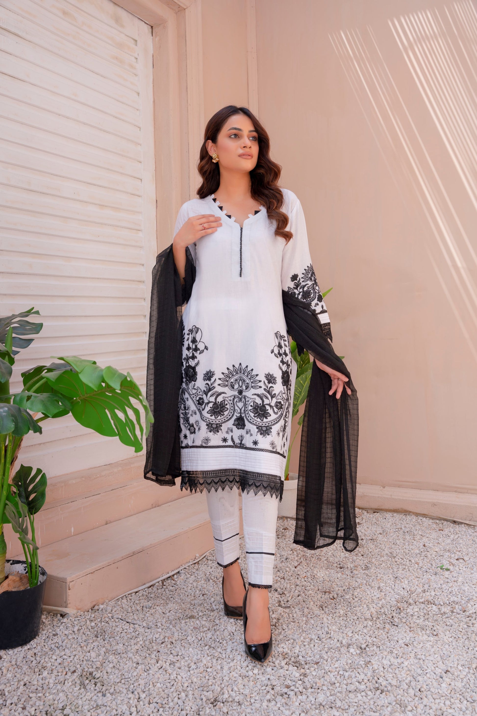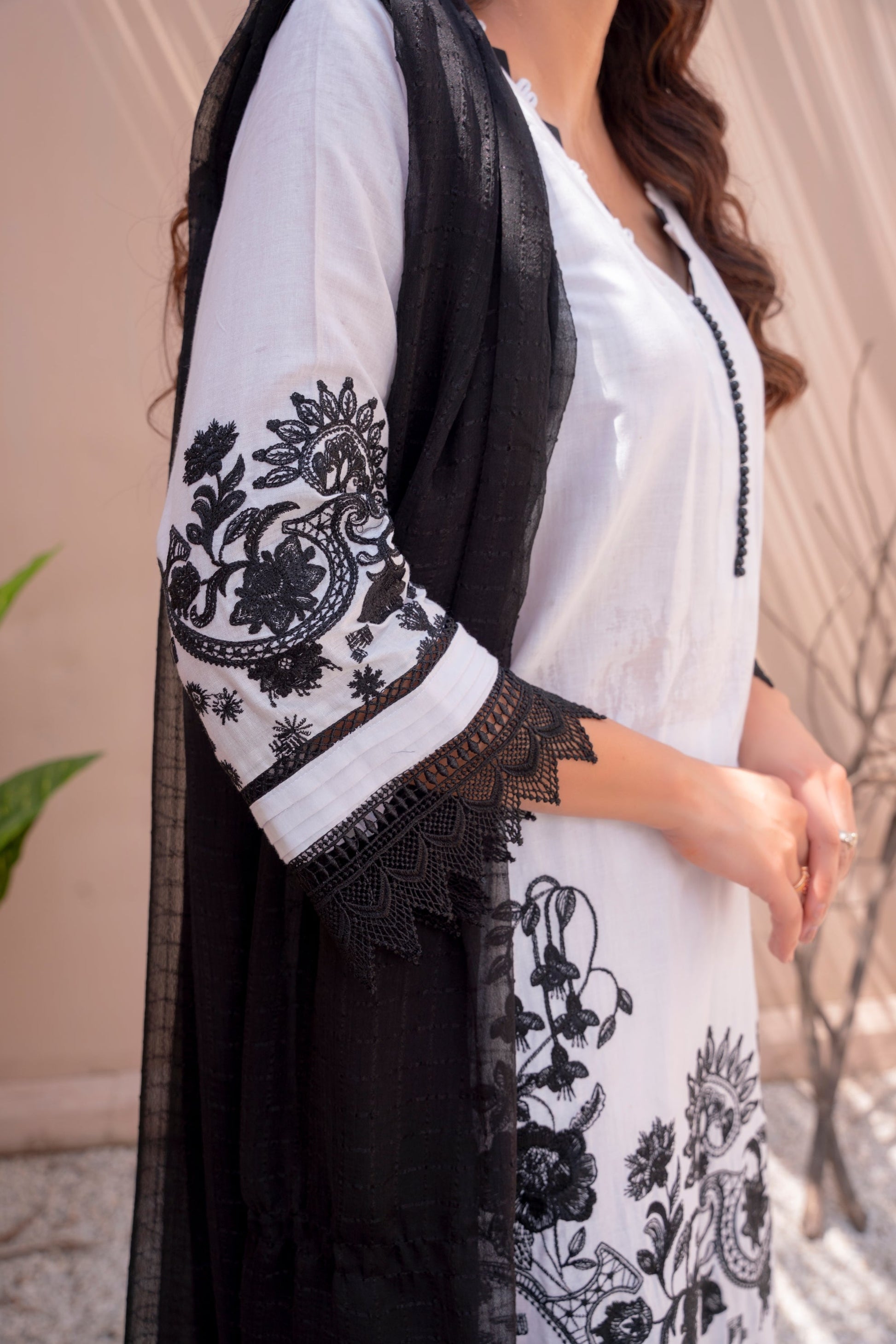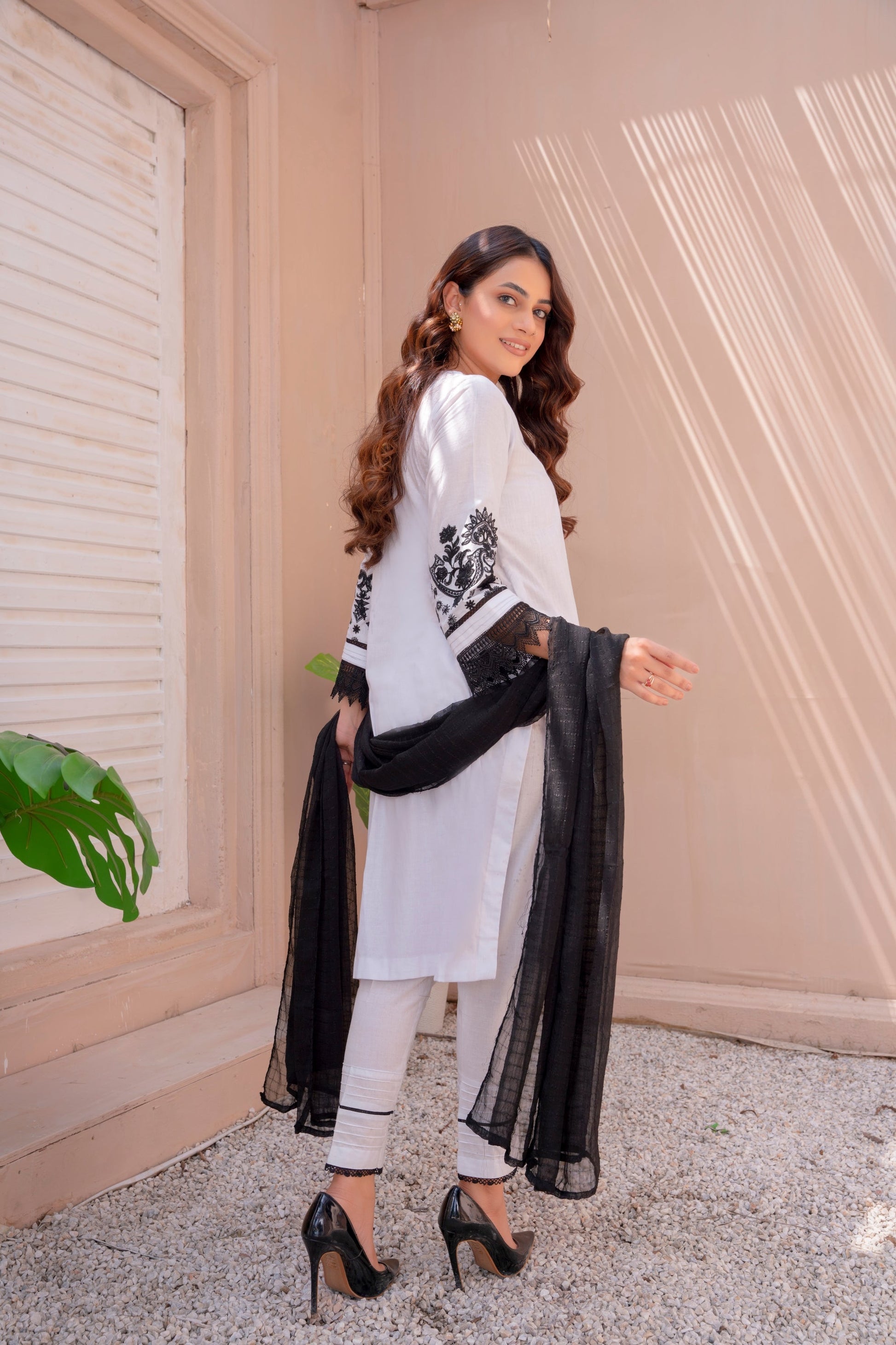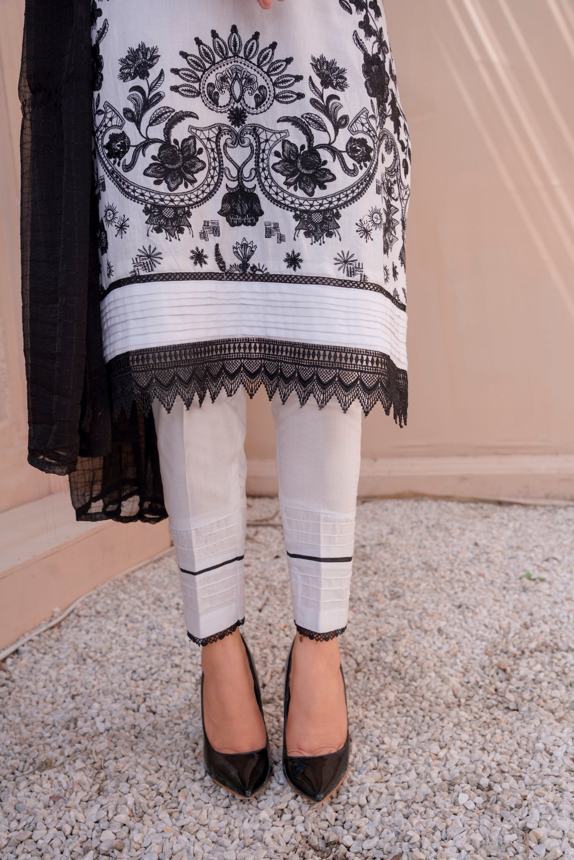 Step into sophistication with this 3-piece ready-to-wear outfit crafted from breathable breeze cotton. The kurta boasts intricate black embroidery and delicate lace details on the hem, exuding timeless allure. Paired with pleated trousers and a flowing chiffon dupatta, this ensemble offers an elegant and effortlessly chic look for any occasion.