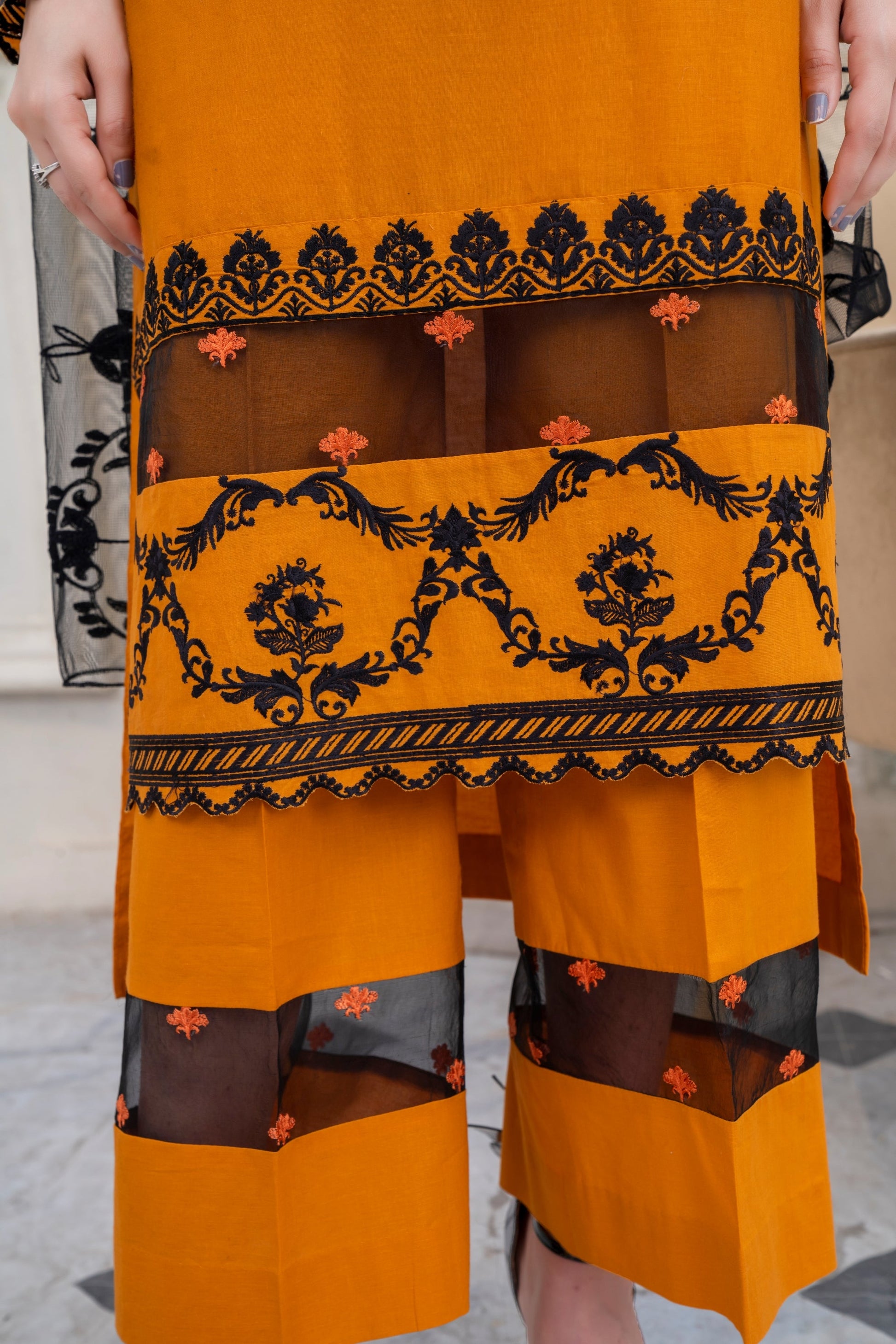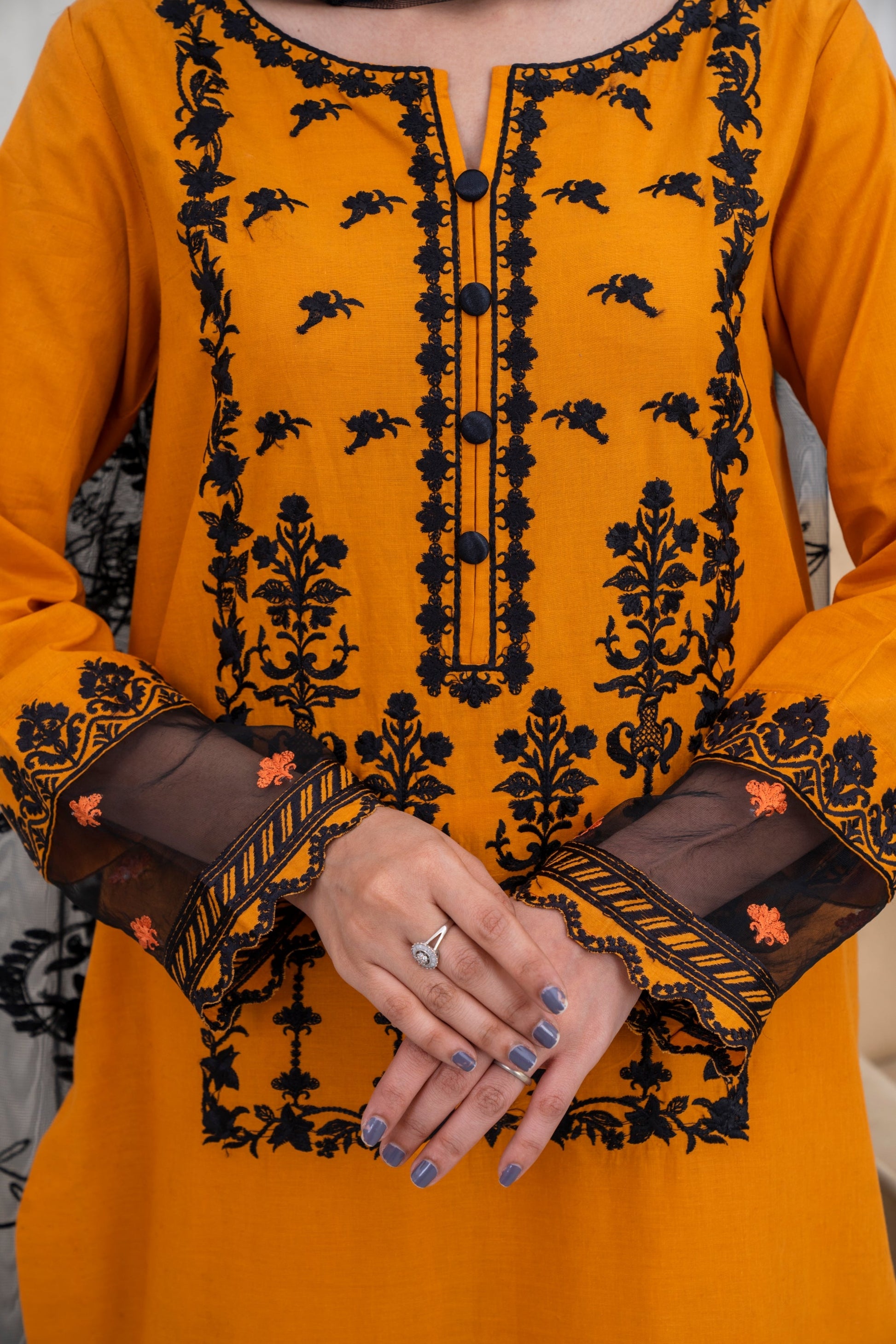 A beautifully crafted long shirt made with premium breeze cotton is illustrated in an appealing shade of mustard yellow. Embellishments feature a fully embroidered front in soft contrasting hues enhanced with organza patchwork at the sleeves and hem.