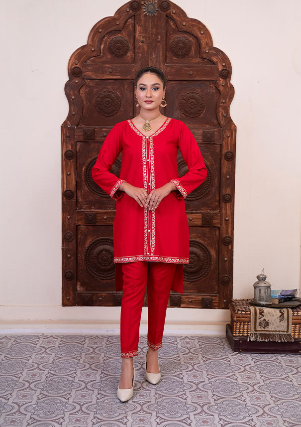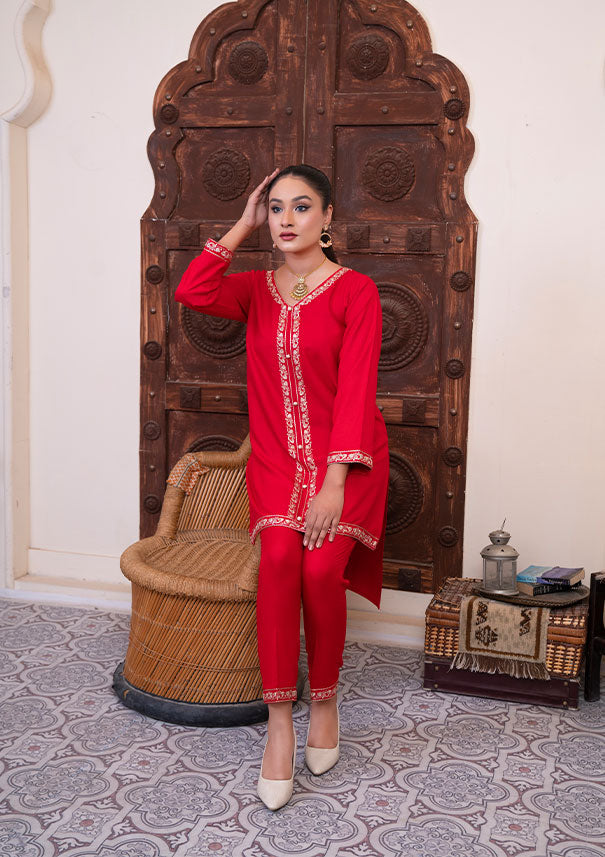 Opal is a prime example of elegance and grace. This gorgeous Dhanak dress is uplifted by exquisite floral embroidered straight Patti on its front, sleeves, and trouser hem.