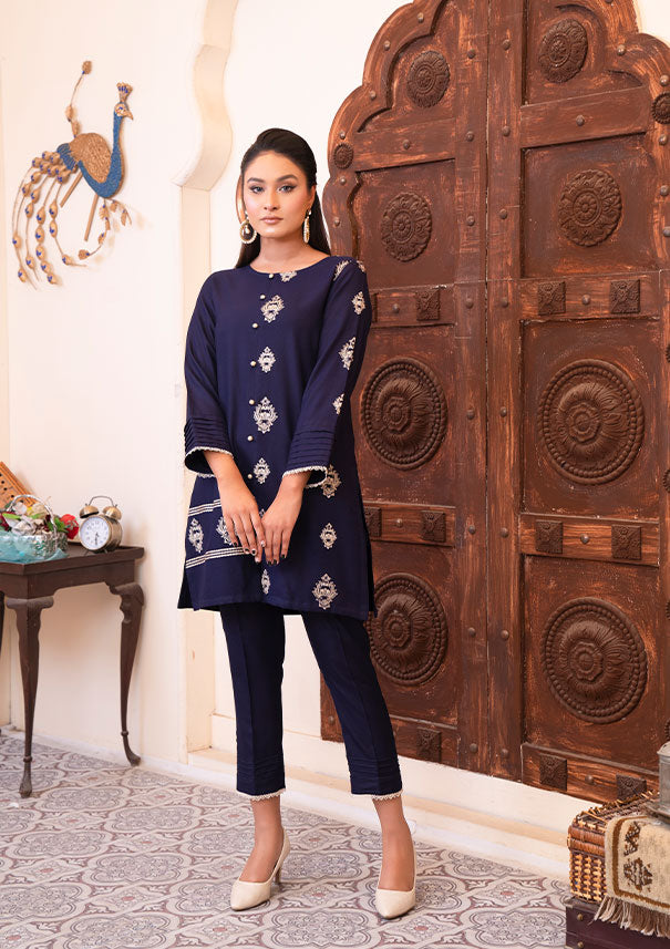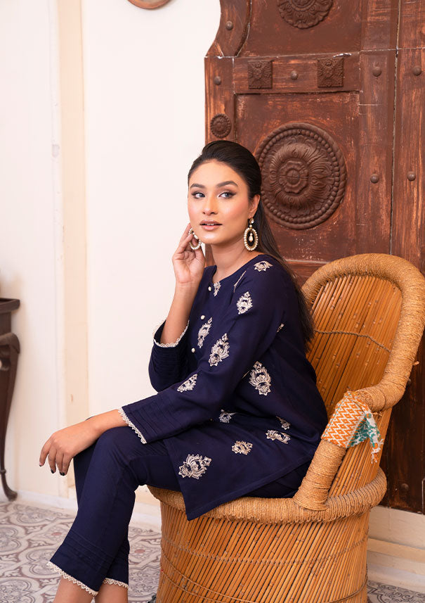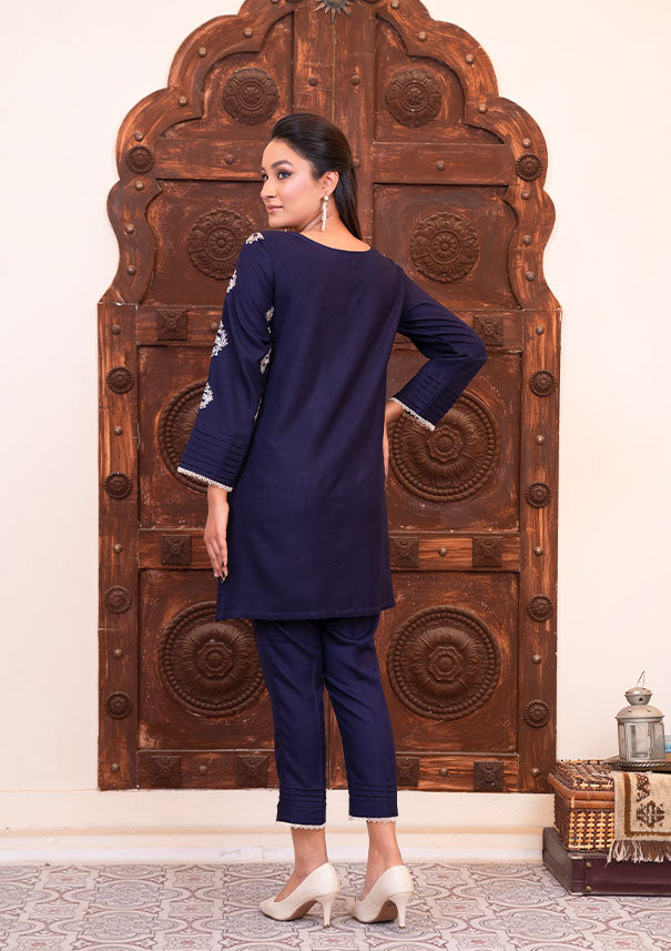 Cut from pure dhanak, this Asymmetric set of separate features modern and exquisite embroidery with this glorious Sapphire blue outfit with details of laces, and pleats on sleeves and trouser bottom.