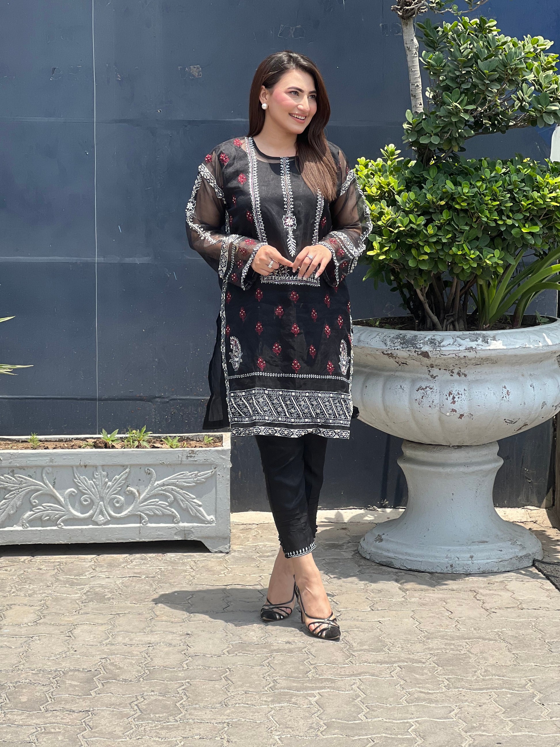 ZIBAISH', 3pc Black organza drop shoulder cutline straight block printed with embellished kurta paired with an undershirt.