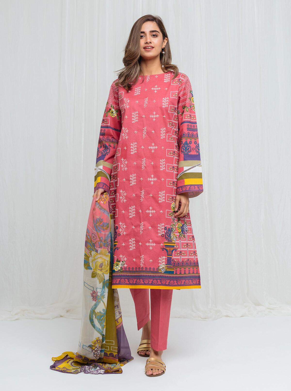 Print Embroidered Lawn Shirt: 2.9 MPrinted Blended Chiffon Dupatta: 2.5 MDyed Pants: 2.5 M