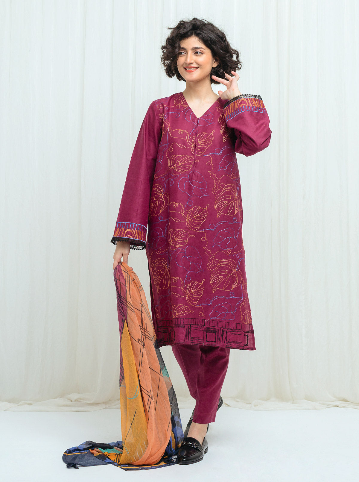 1 Mtr Embroidered Lawn Front, 0.7 Mtrs Embroidered Sleeve Patti, 1.5 Mtrs Dyed Lawn Back And Sleeve, 2.5 Mtrs Digital Printed Blended Chiffon Dupatta