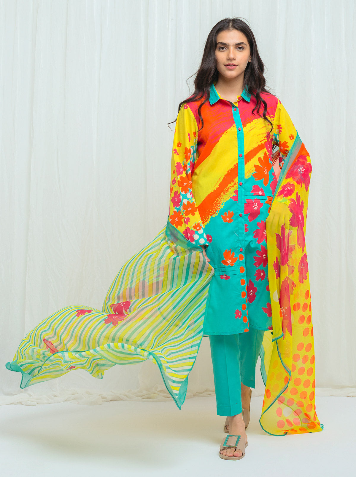 Printed Cambric Shirt: 2.9 MPrinted Blended Chiffon Dupatta: 2.5 MDyed Cambric Pants: 2.5 MFabric:Cambric
