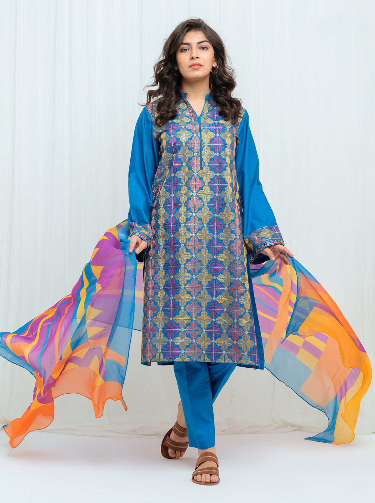 Heavy Embroidered Cambric Front: 1 MDyed Cambric Back and Sleeve: 1.5 MEmbroidered Sleeve Patti: 0.5 MDigital Printed Blended Chiffon Dupatta: 2.5 MFabric:Cambric