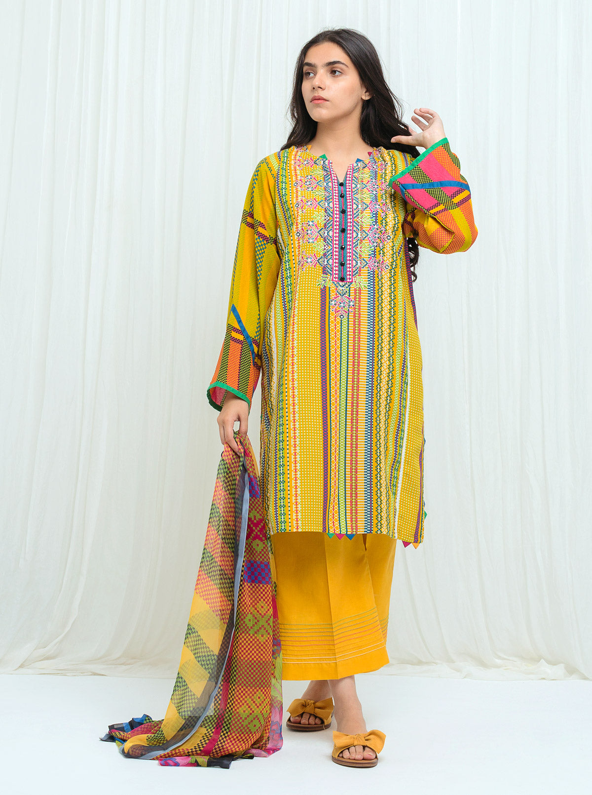 2.9 Mtrs Printed Karrandi Shirt with Embroidery2.5 Mtrs Printed Blended Chiffon Dupatta2.5 Mtrs Dyed PantsKarrandi