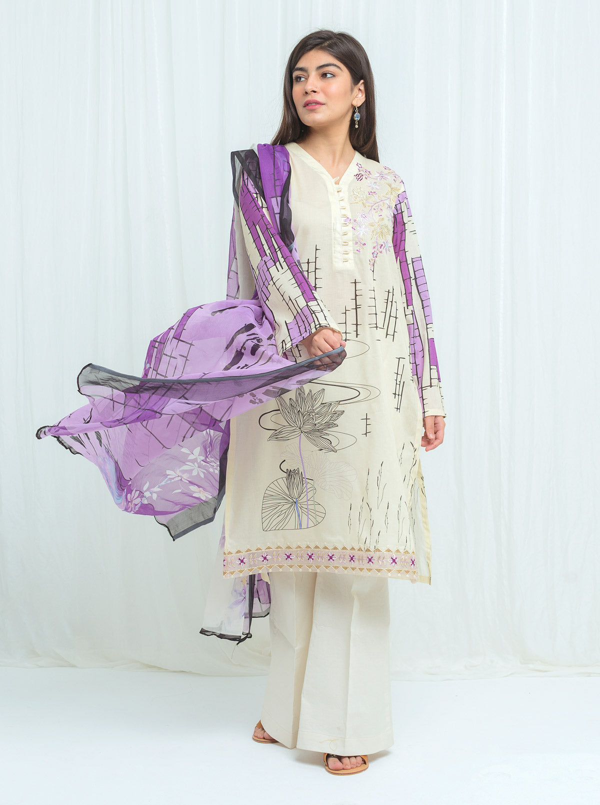 Digital Printed Lawn Shirt With Embroidery: 2.9 MEmbroidered Border: 0.7 MDigital Printed Blended Silk Dupatta: 2.5 MDyed Pants: 2.5 M Fabric:Lawn