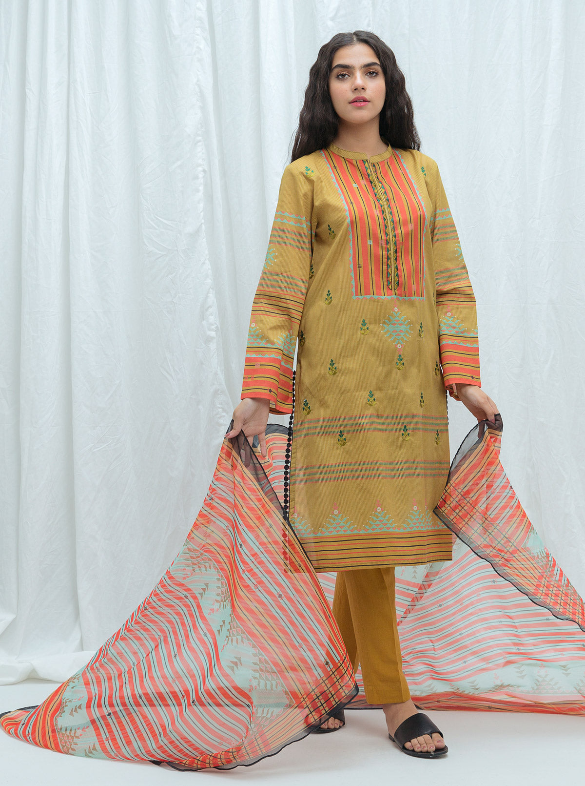 2.9 Mtrs Printed Lawn Shirt with Embroidery, 0.7 Mtrs Embroidered Neckline Patti, 2.5 Mtrs Printed Blended Chiffon Dupatta