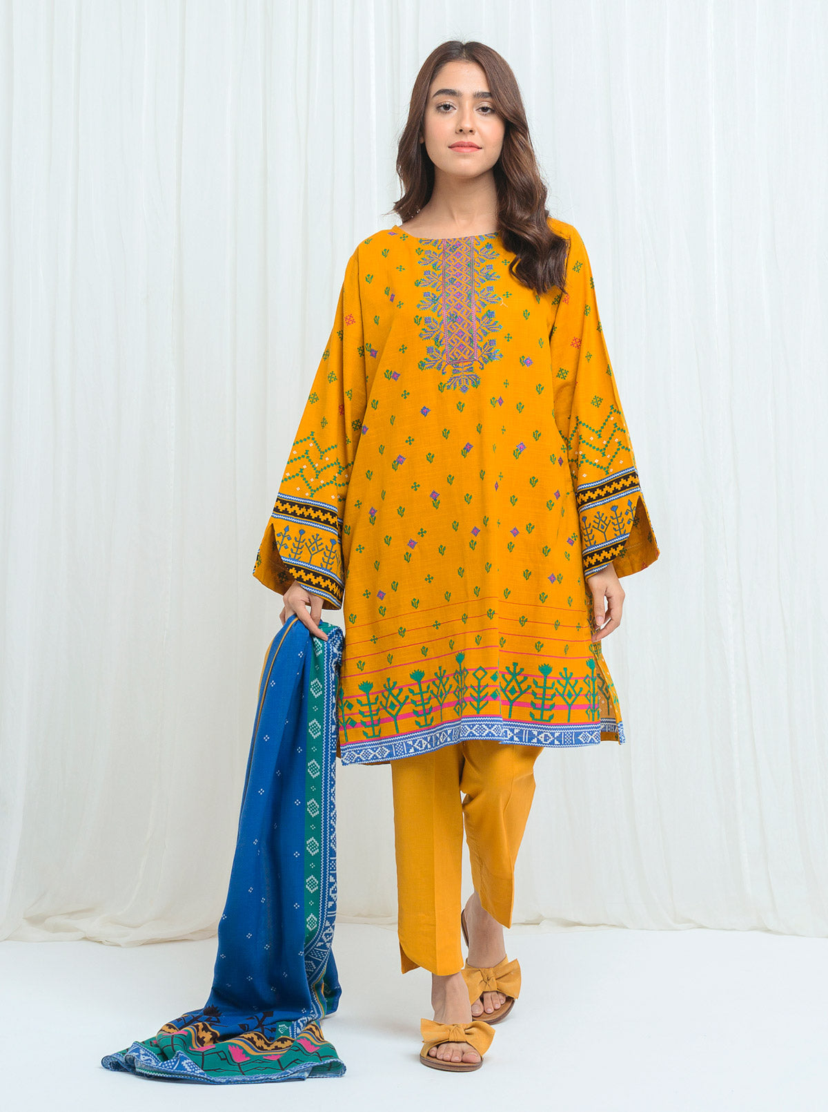 2.9 Mtrs Printed Khaddar Shirt with embroidery 2.5 mtrs Printed Shawl 2.5 Mtrs Dyed PantsKhaddar
