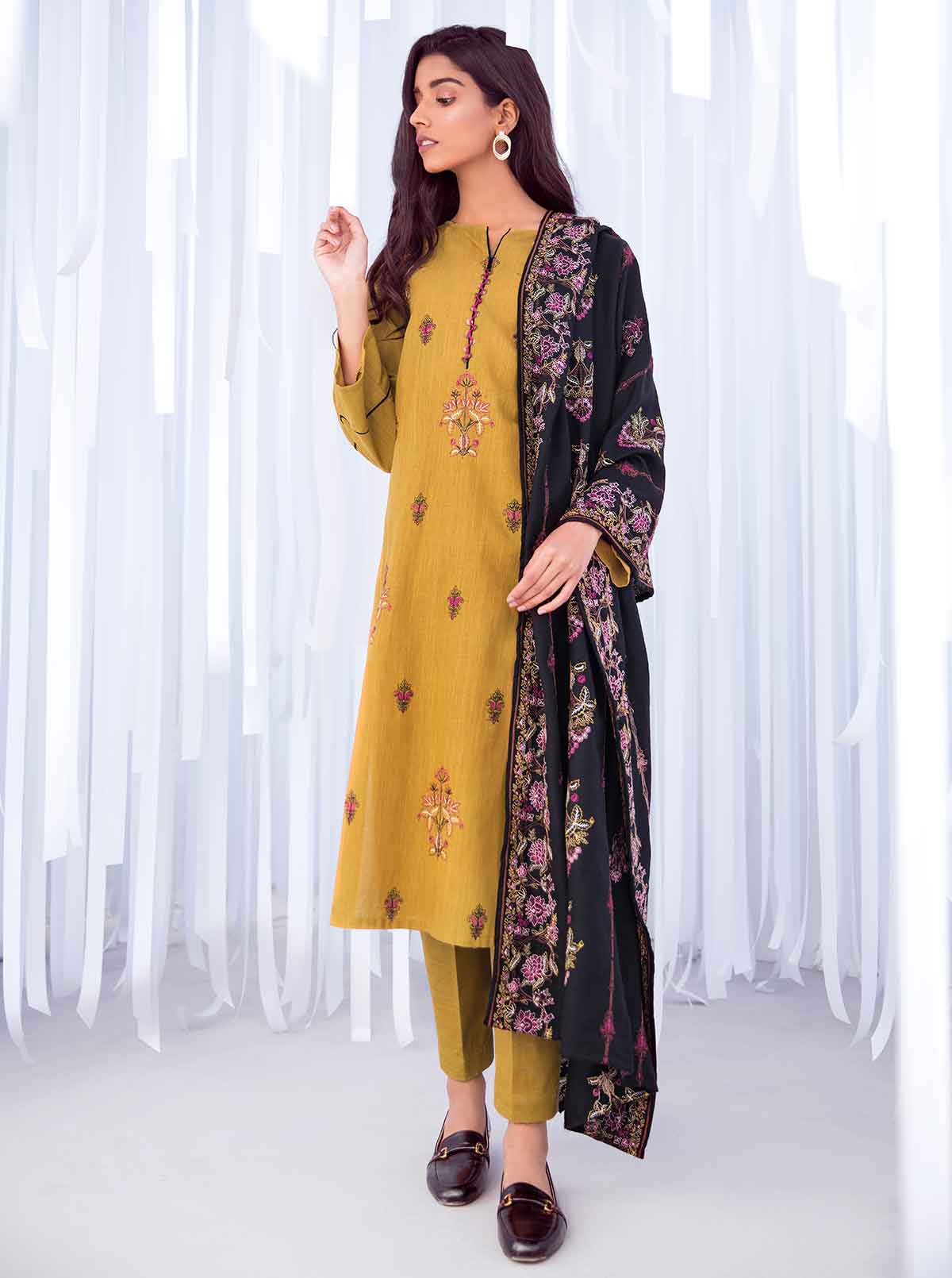 Embroidered Khaddar Front On Fabric: 1 MWoven Shawl: 2.5Dyed Back and Sleeve: 1.7 MDyed Pants: 2.5 M