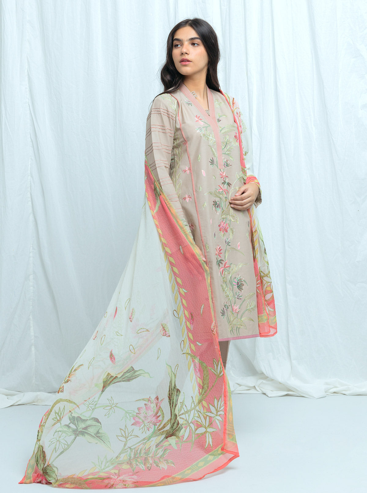 1.14 Mtrs Embroidered Front, 0.5 Mtrs Embroidered Sleeves, 1.14 Mtrs Dyed Lawn Back, 2.5 Mtrs Digital Printed Chiffon Dupatta, 2.5 Mtrs Dyed Pants