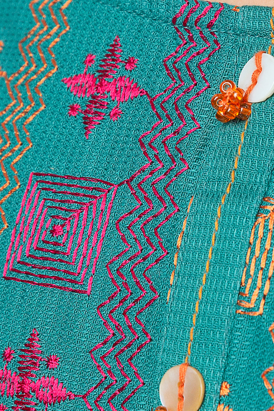 Basic Embroidered Shirt With A Boat Neckline And Drop Shoulder Having Round Hem And Fray Edges On Sleeves. .Fabric:DobbyWhat You'll Get: Shirt