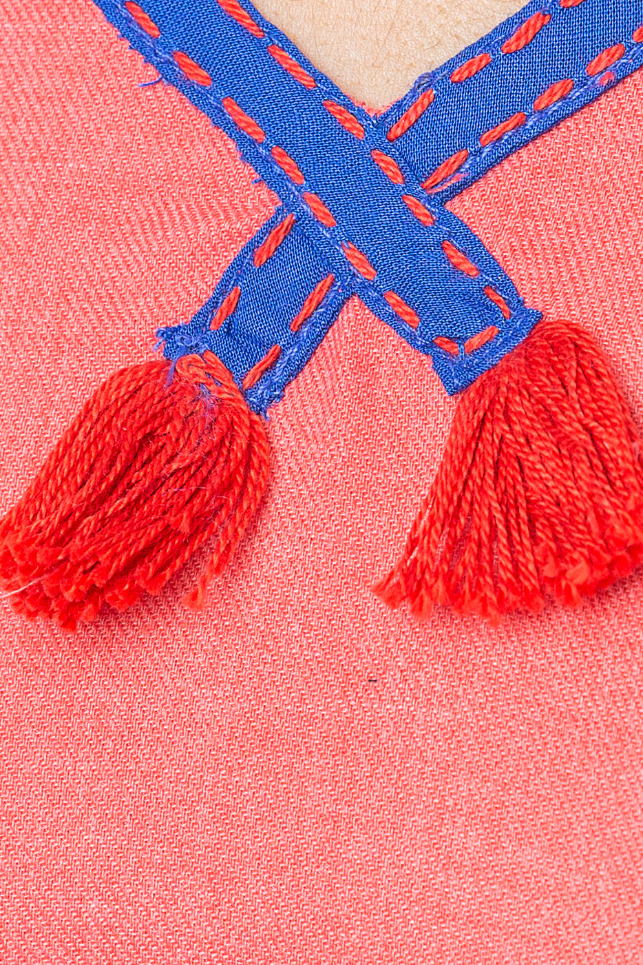 Basic shirt with V-neckline and contrasting trim piping with handwork detail, embroidered border on front hem and sleeves with taarkashi insert.Fabric:TwillWhat You'll Get: Shirt