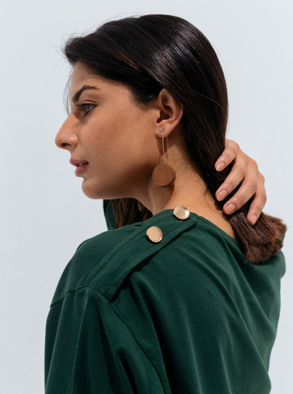 Cut out v-neckline loose fit jersey top with epaulettes and metallic buttons. Pants with fake fly, folded cuffs and pockets.