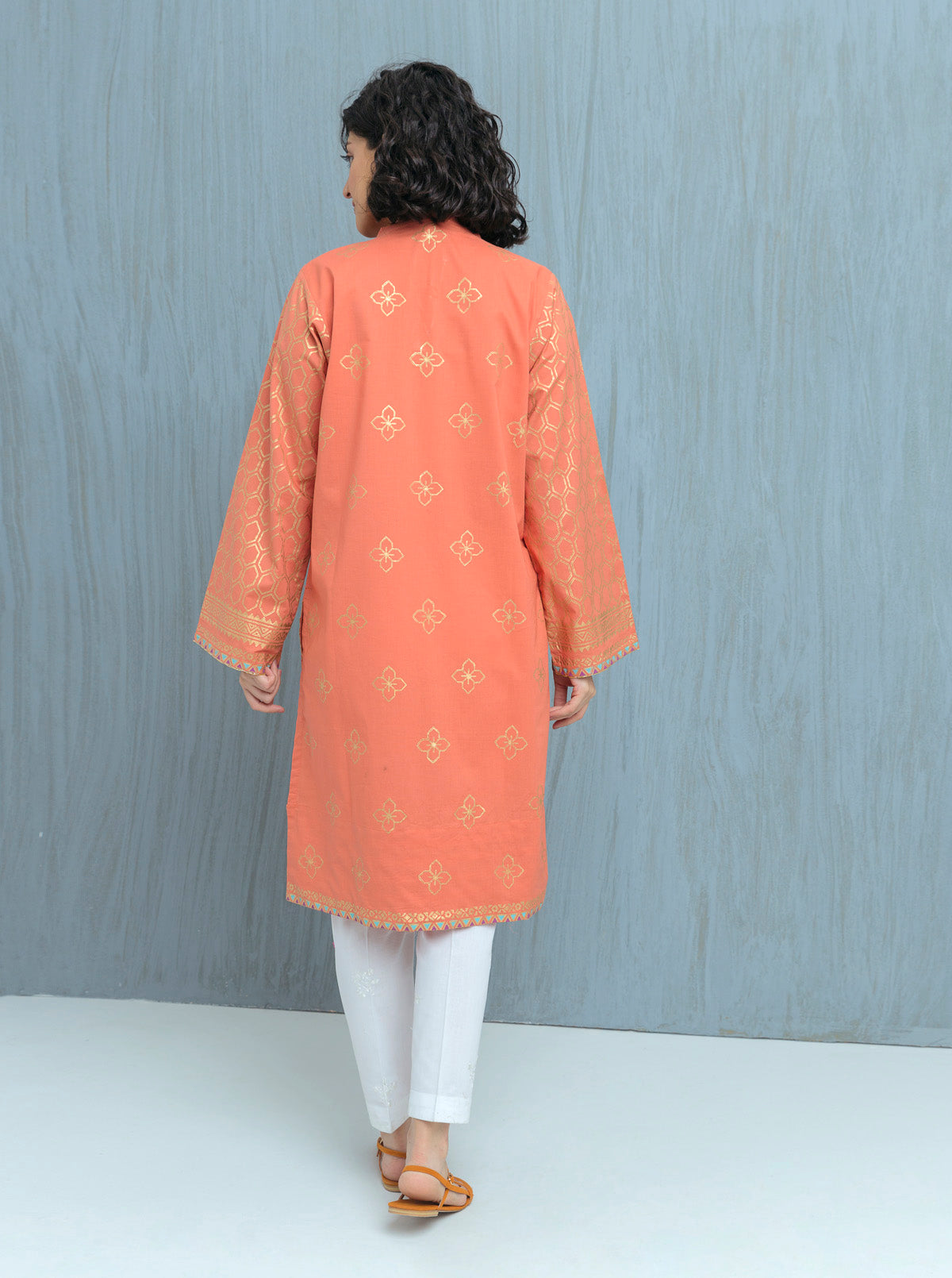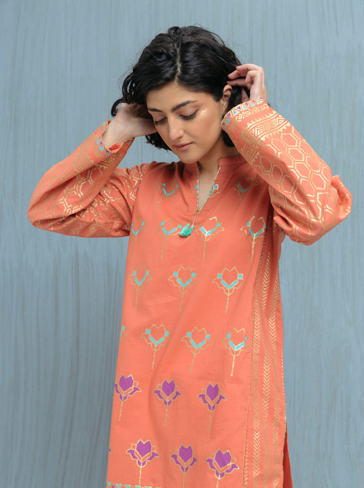 Artisan Collection Full Block Print Shirt With Band Neck And Front Piping With Contrast Tassles. Full Block On Sleeves Fabric: Lawn What You'll Get: Shirt Fit: Loose Fit Size & Fit: Model Height Is 5'4"