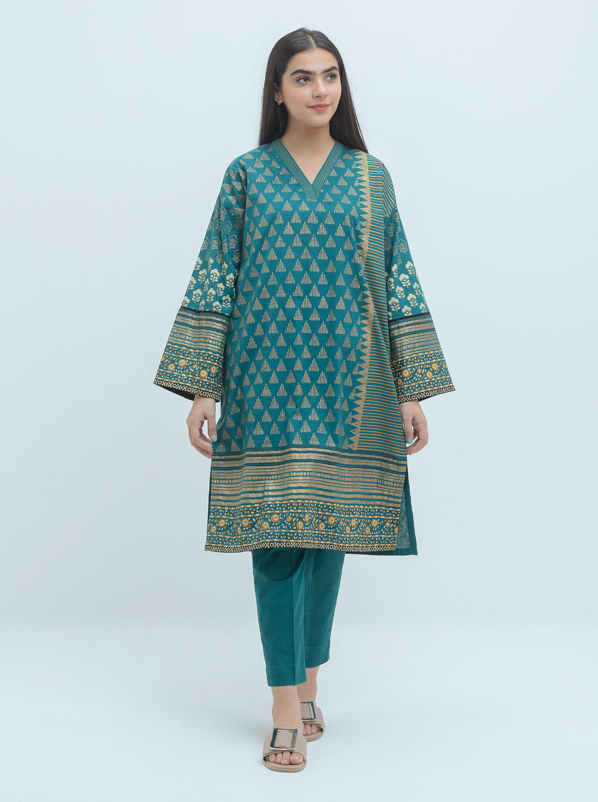 Block printed full shirt with chunky block printed borders on sleeves and shirt.Fabric: Lawn What You'll Get: Shirt Fit: Extended Shoulder Size & Fit: Model Height Is 5'4"