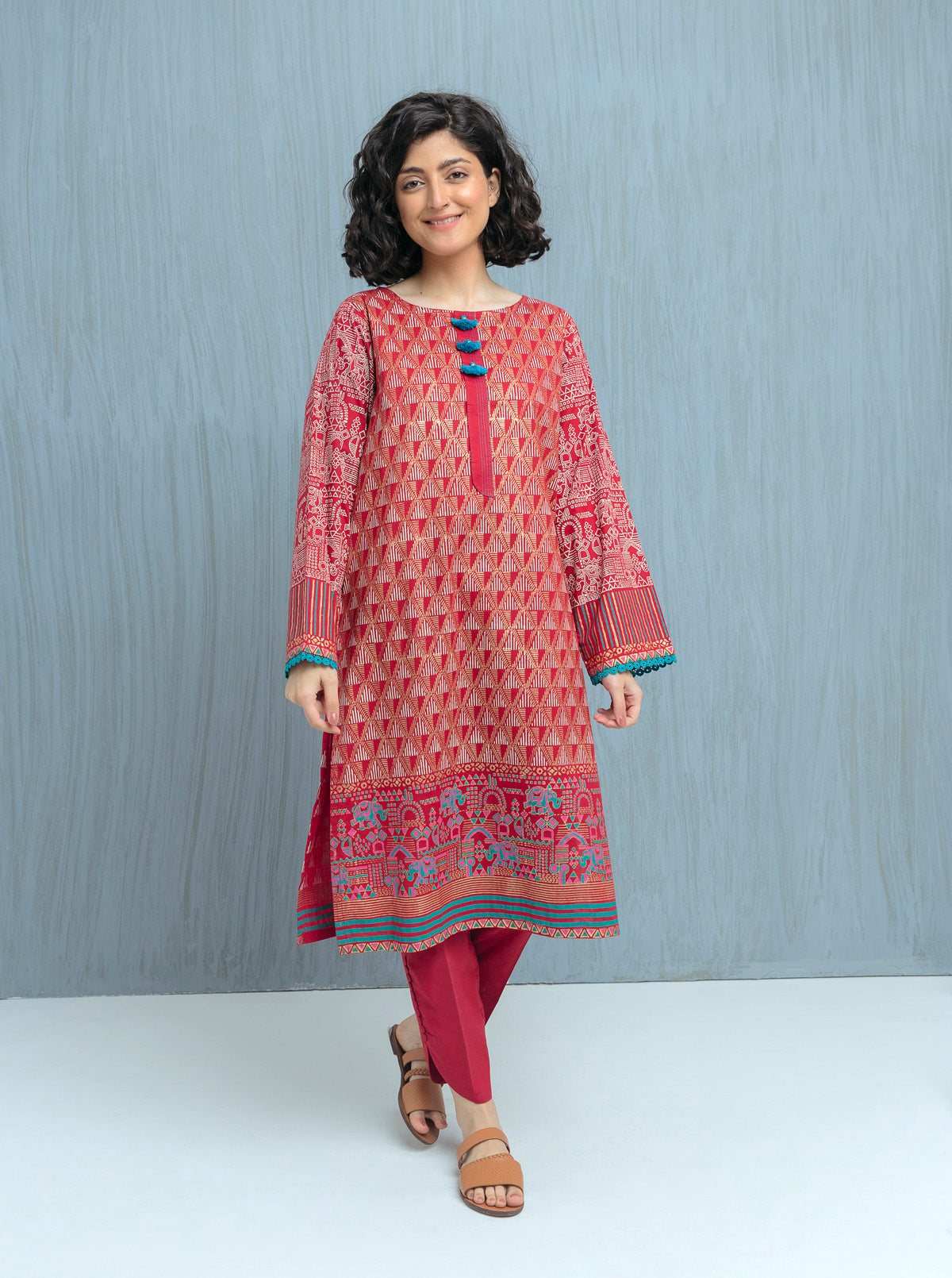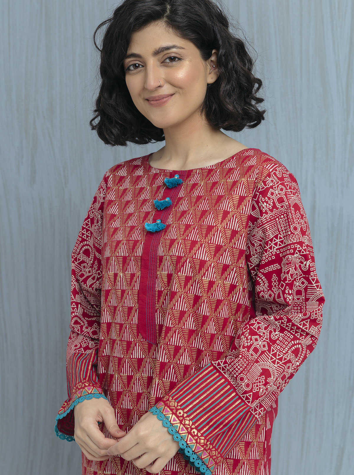 Artisan Collection Full Front Gold Block Print With Contrast Colour Border On Front. Full Block Print On Sleeves. Fabric: Lawn What You'll Get: Shirt Fit: Regular Fit Size & Fit: Model Height Is 5'4"