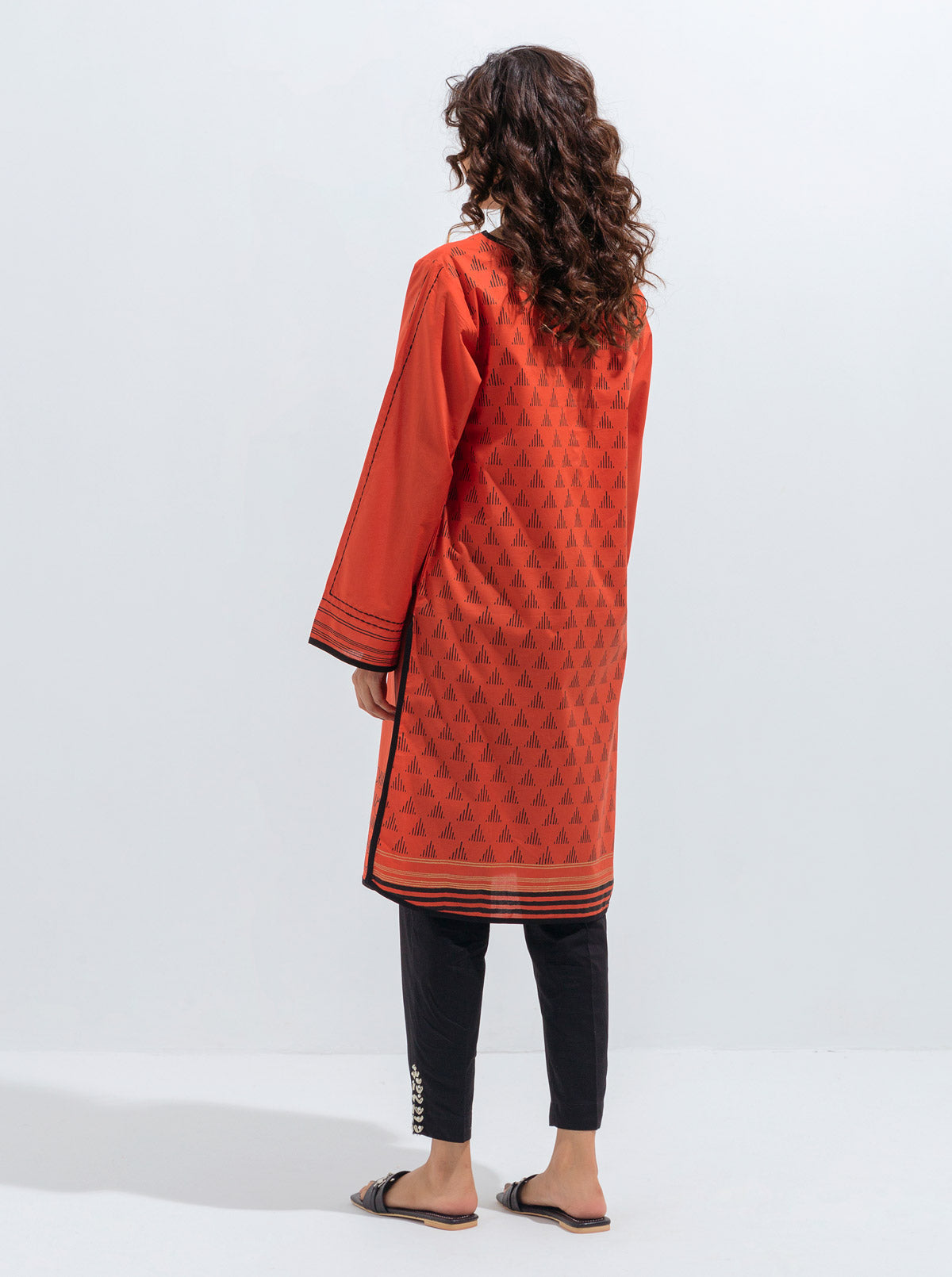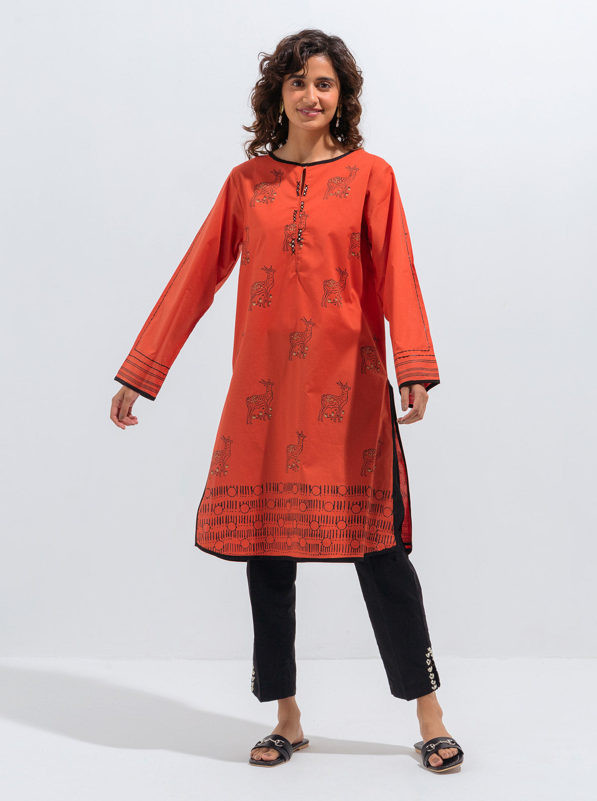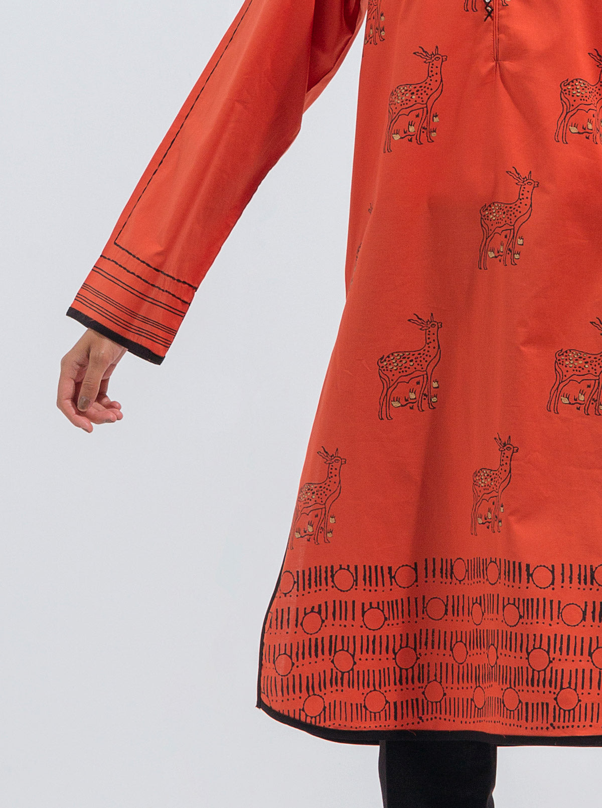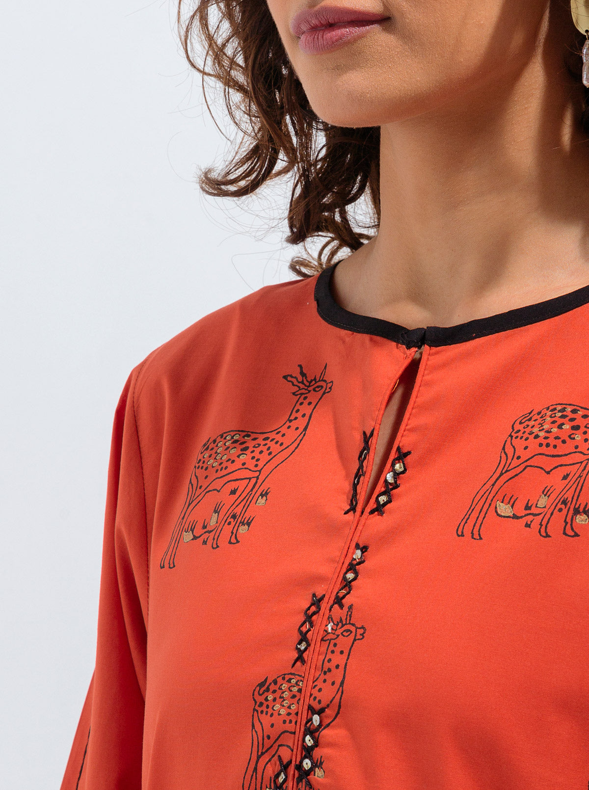 Basic Block Printed Shirt With Round Neckline And Handwork Detail On Placket, And Contrasting Trim Detail On Front And Sleeves. Fabric: Lawn