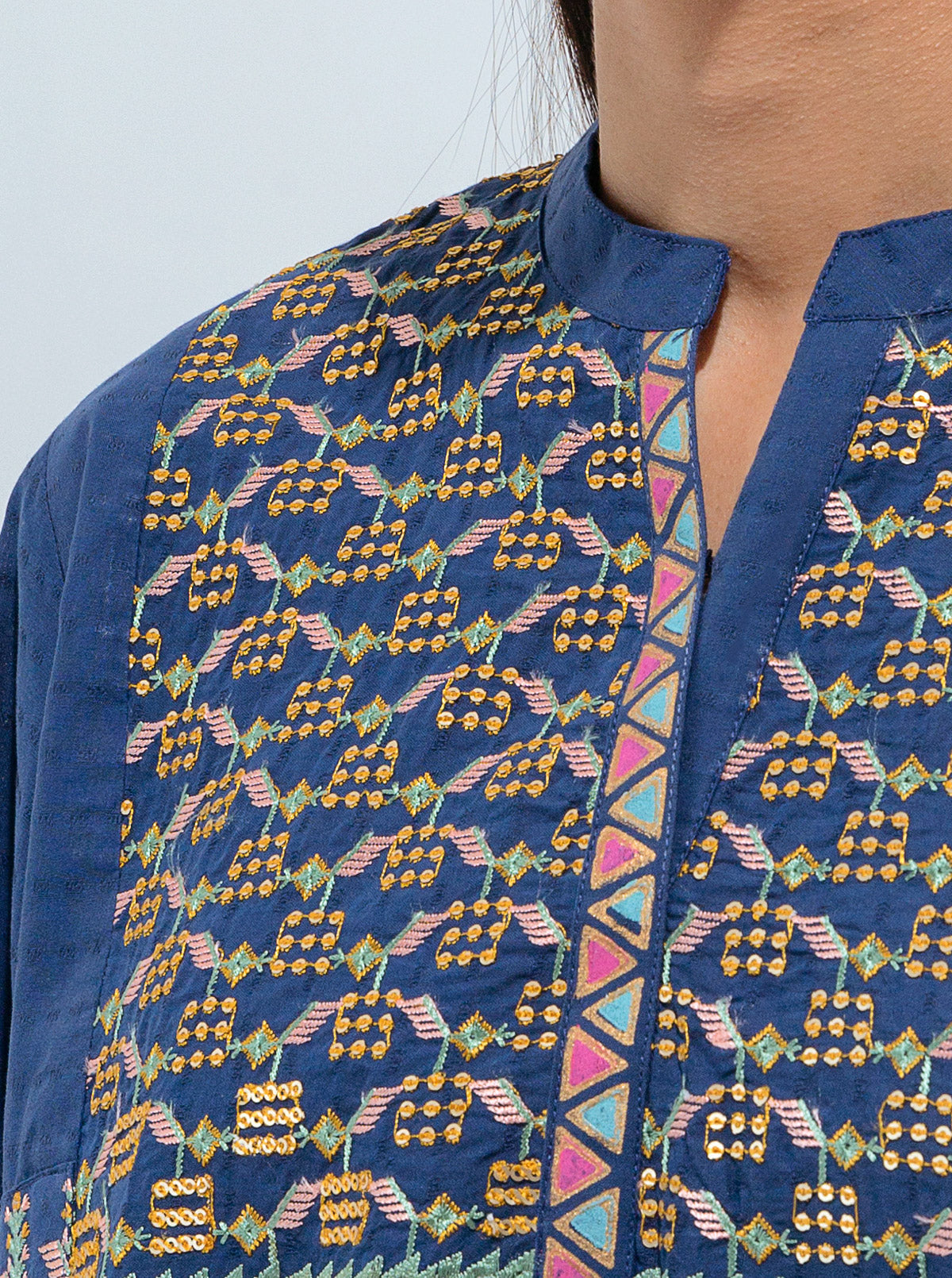 Band collar neckline with multi colored embroidery on front bodice and panels. Screen printed border on placket and sleeves paired with a matching embroidered pant. Fabric: Textured Cotton What You'll Get: Shirt+Pant Fit: Loose Fit Size & Fit: Model Height is 5'4"