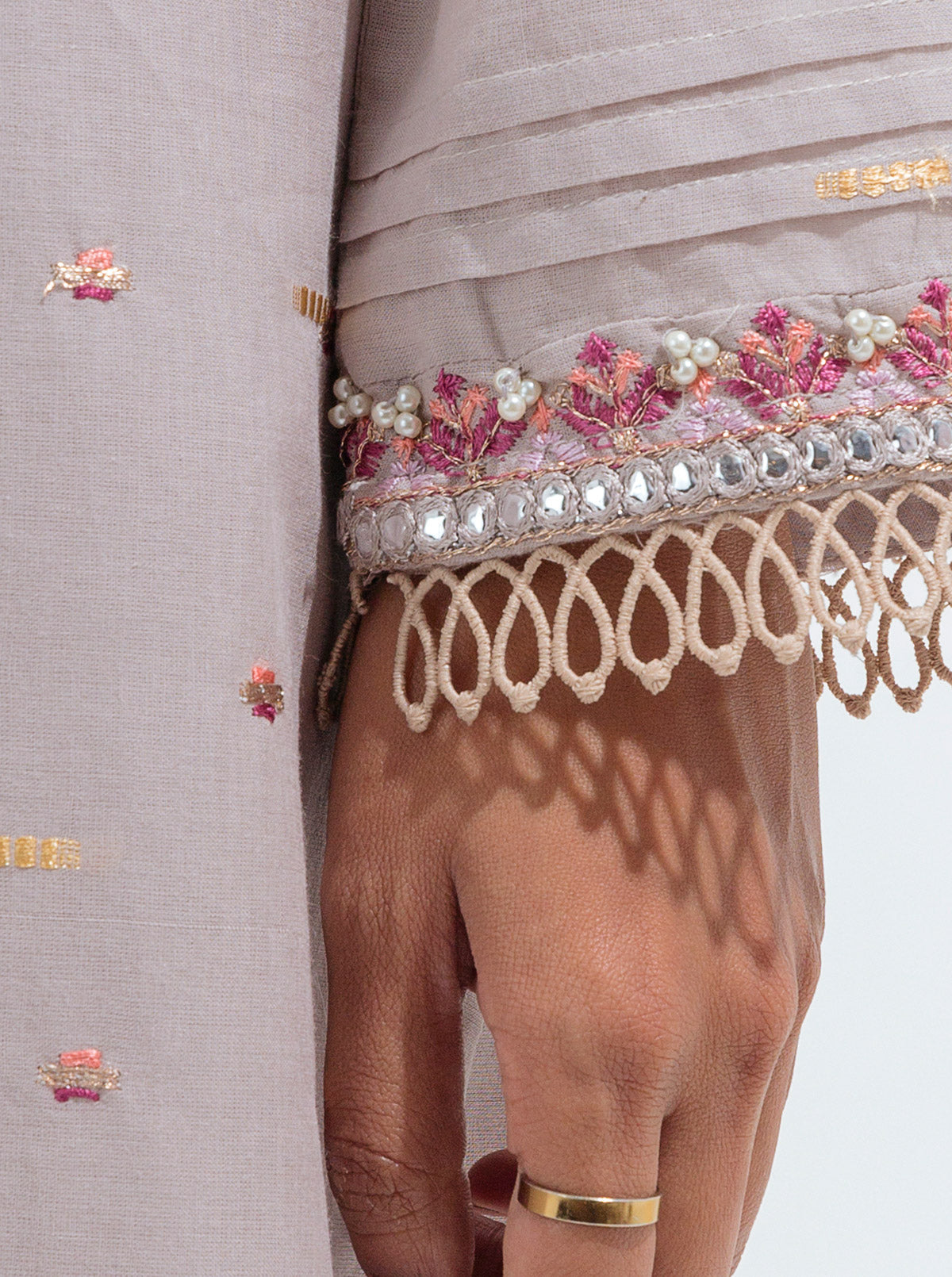Basic V neckline with embroidery on border and sleeves in pastel hues . Lace detail on sleeves Fabric: Jacquard