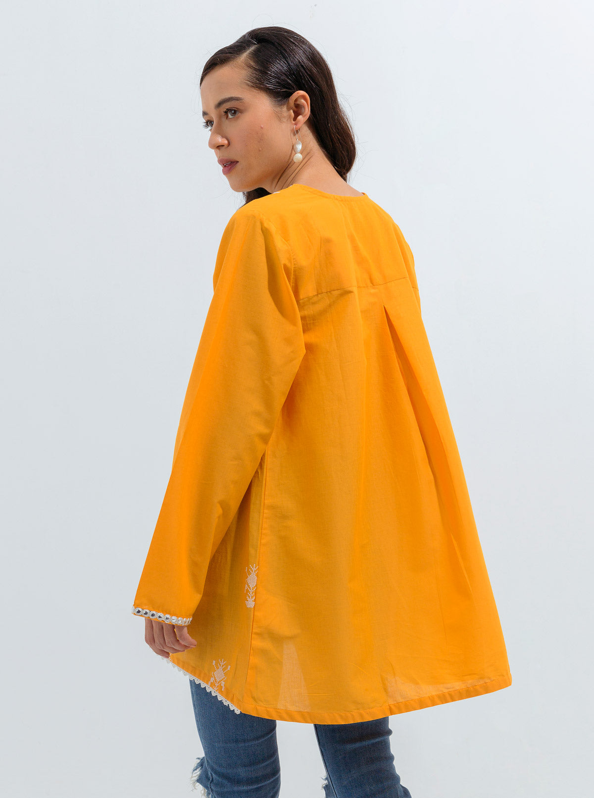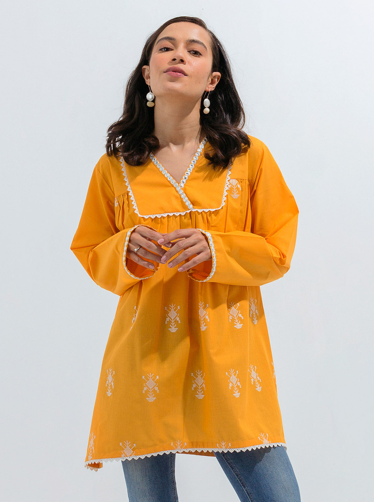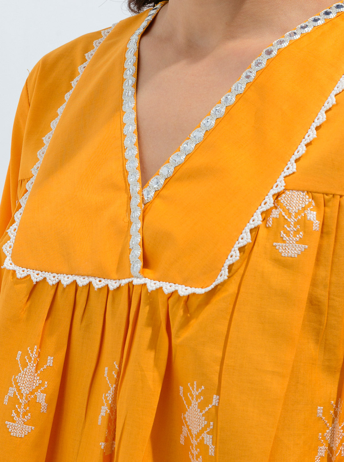 Basic V neckline peplum with full embroidered front and border on sleeves hem along with lace details. Fabric: Lawn