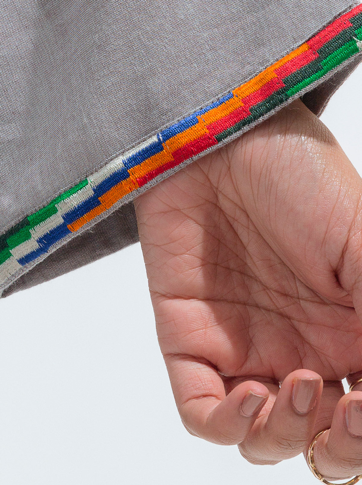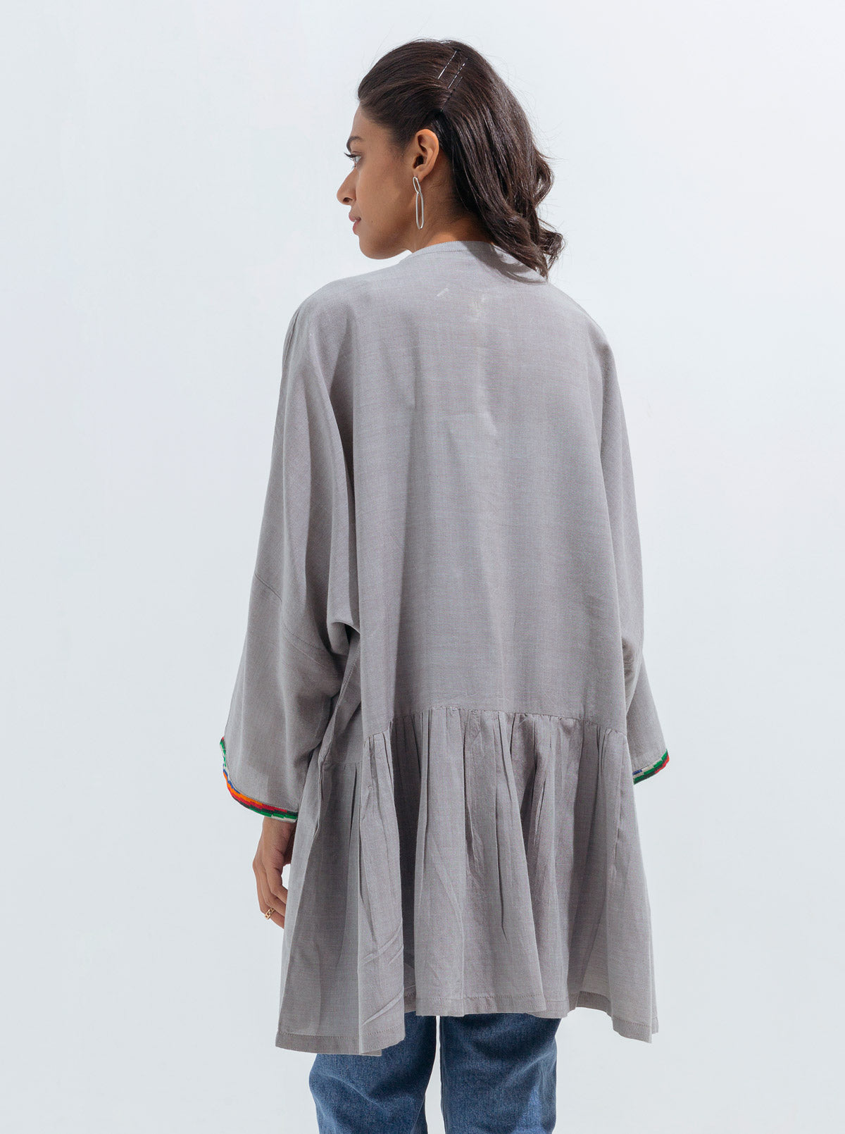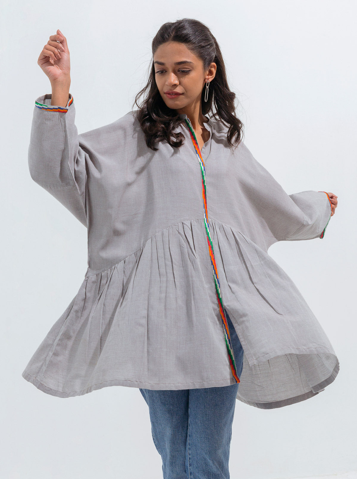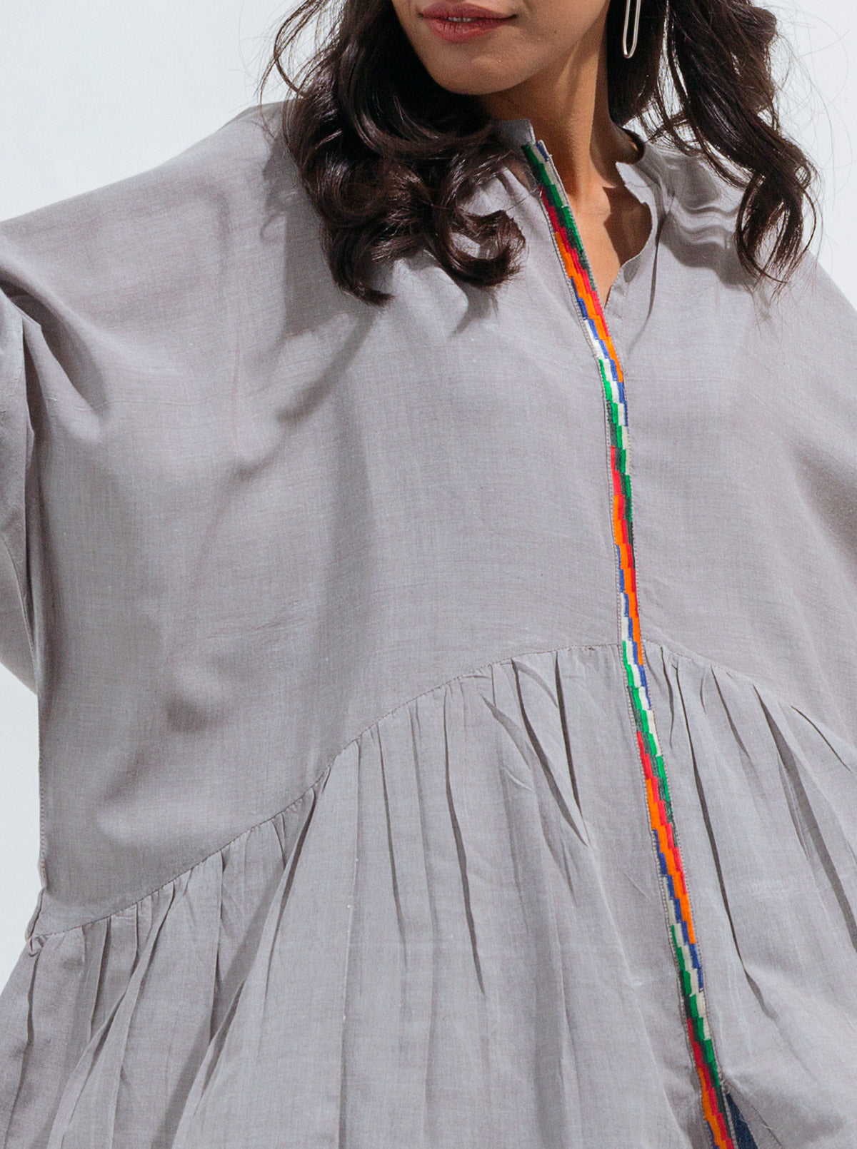 Grey fusion top with gathers and embroidery on front and sleeves Fabric: chambrey
