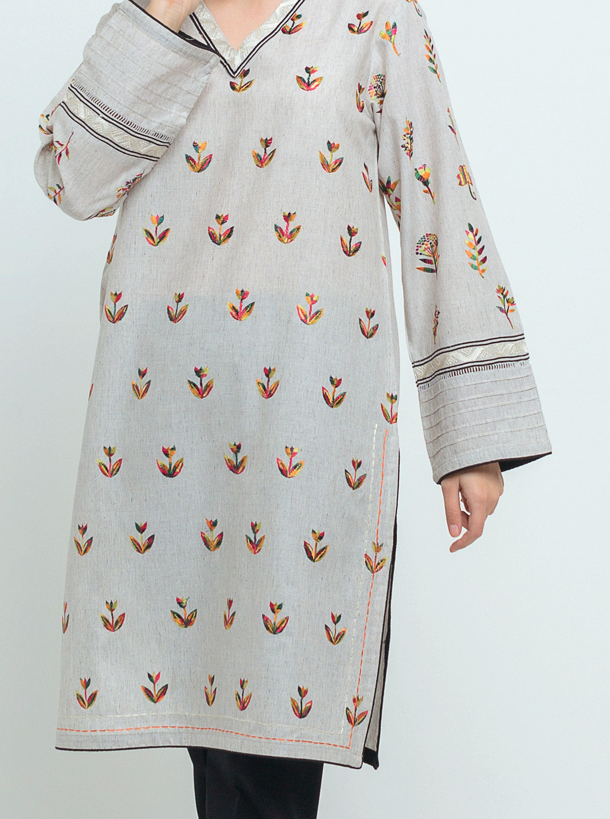 V Neckline With Embroidered Front And Sleeves. Trim And Pleat Detail On Sleeve Border. Fabric:Naps Lawn What You'll Get: Shirt Fit: Regular Fit Size & Fit: Model Height is 5'4" Model is Wearing 8 Size