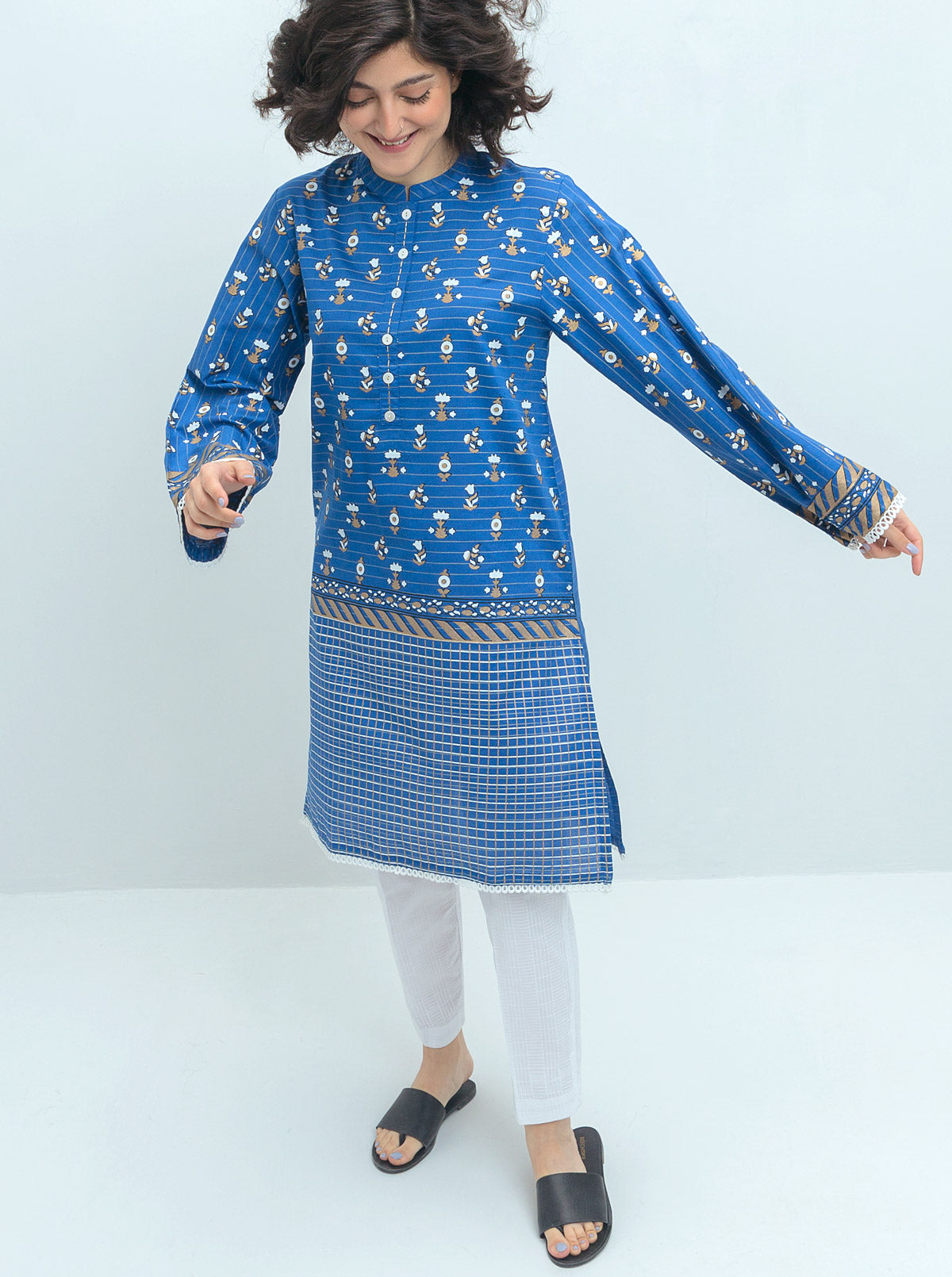Block printed shirt with band neck and front placket with buttons. Fabric: Lawn What You'll Get: Shirt Fit: Regular Size & Fit: Model Height is 5'4"