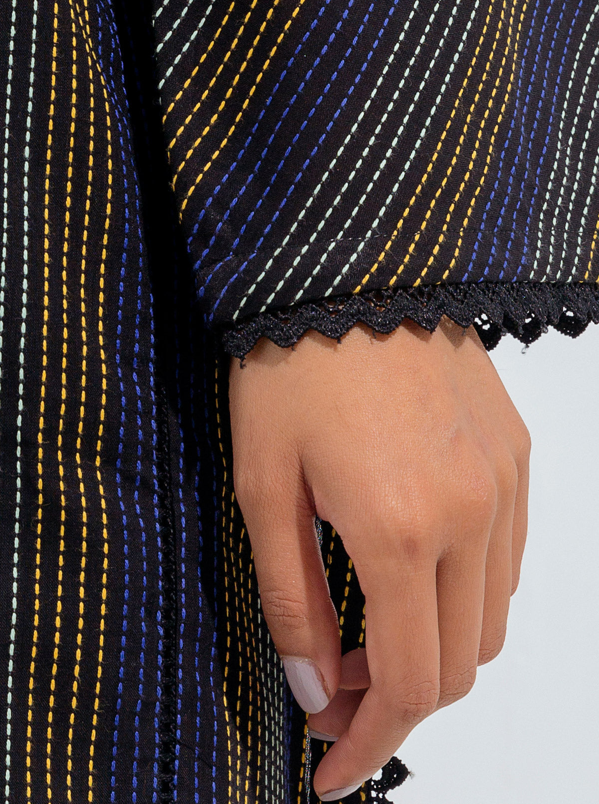 Square Armhole, Band neck with front placket. Basic Jacquard top stitch shirt.Fabric: Jacquard
