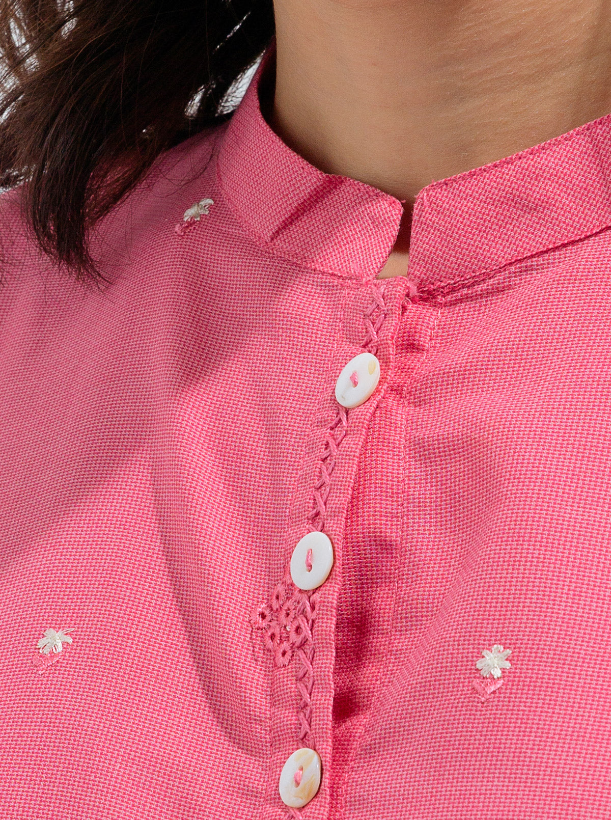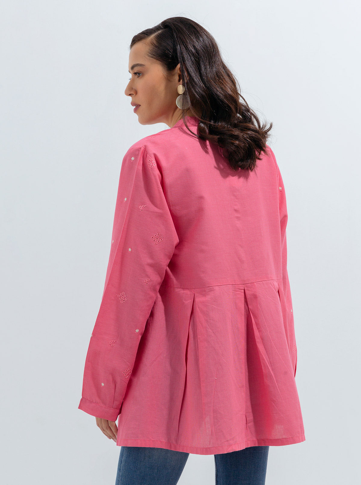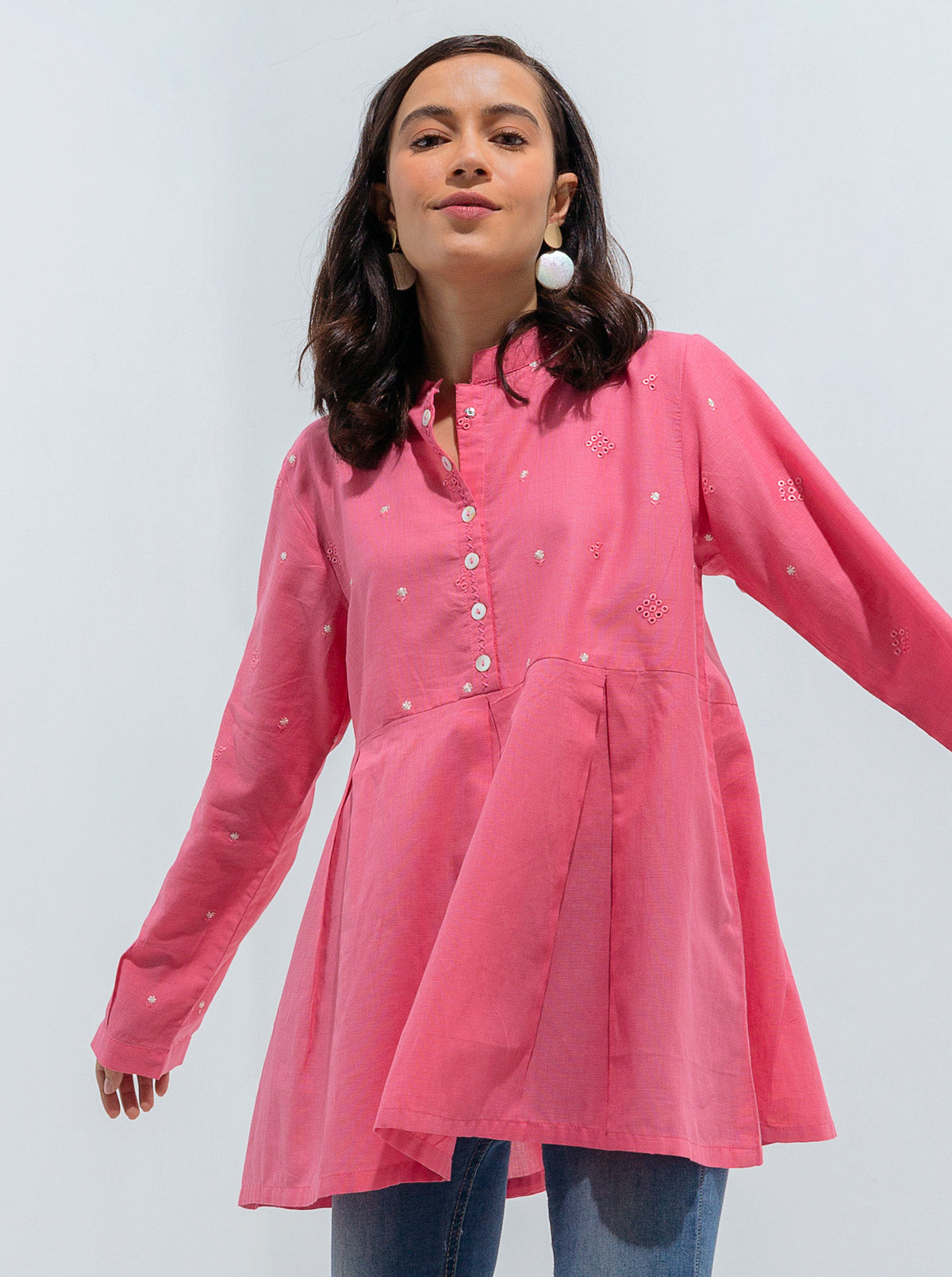 A peplum cut with embroidered yoke and sleeves.Handwork placket detail with Ban Colar Fabric: Textured Cotton