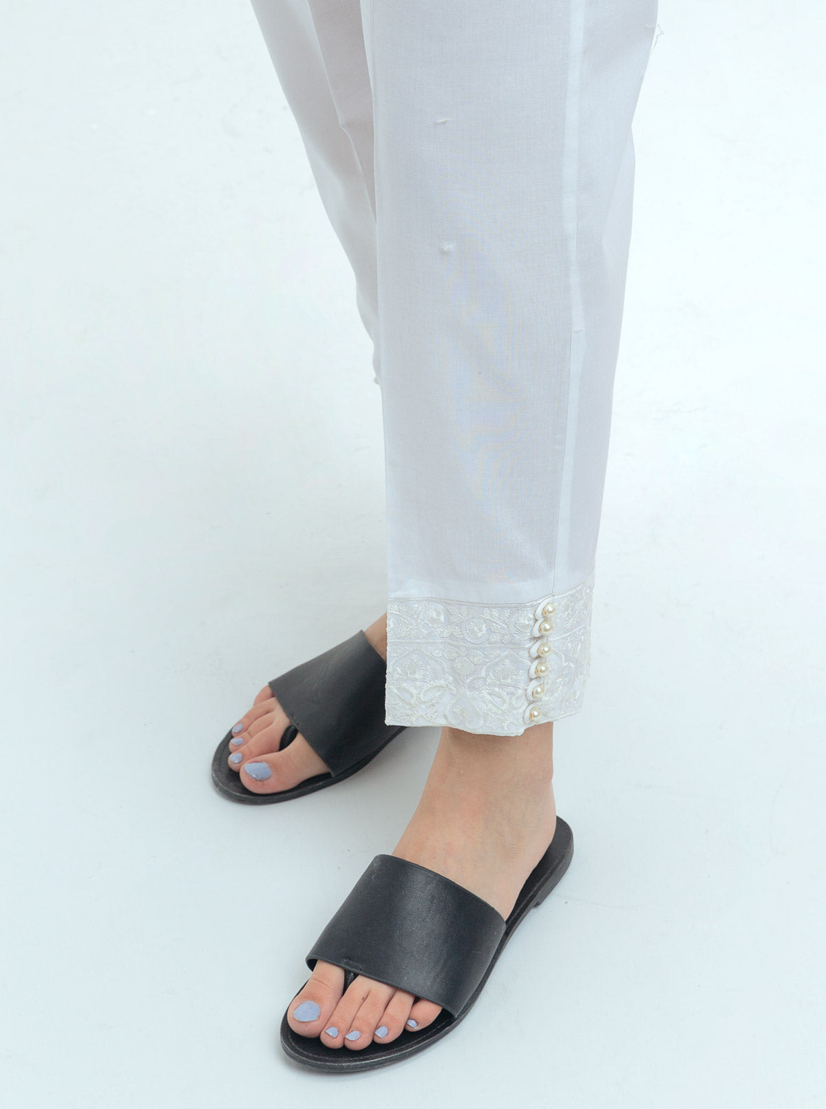 Basic Straight Pants With Embroidered Border And Pearl And Loop Detail Fabric:Cambric