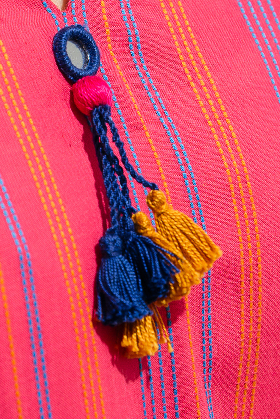Basic Loose Fit Shirt Having A Band Collar With A Tassel And Embroidery On Sleeves. Fabric: Yarn DYed